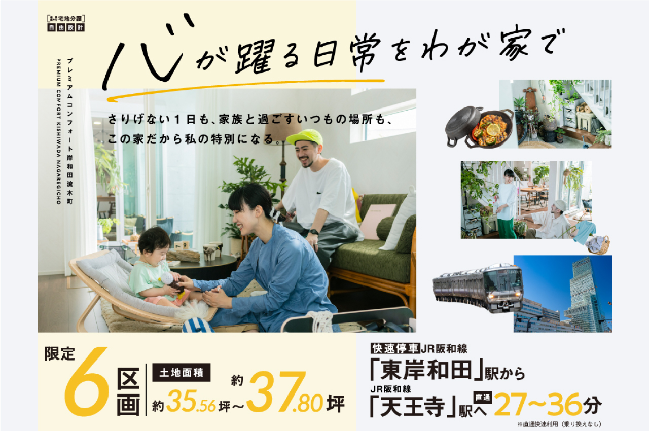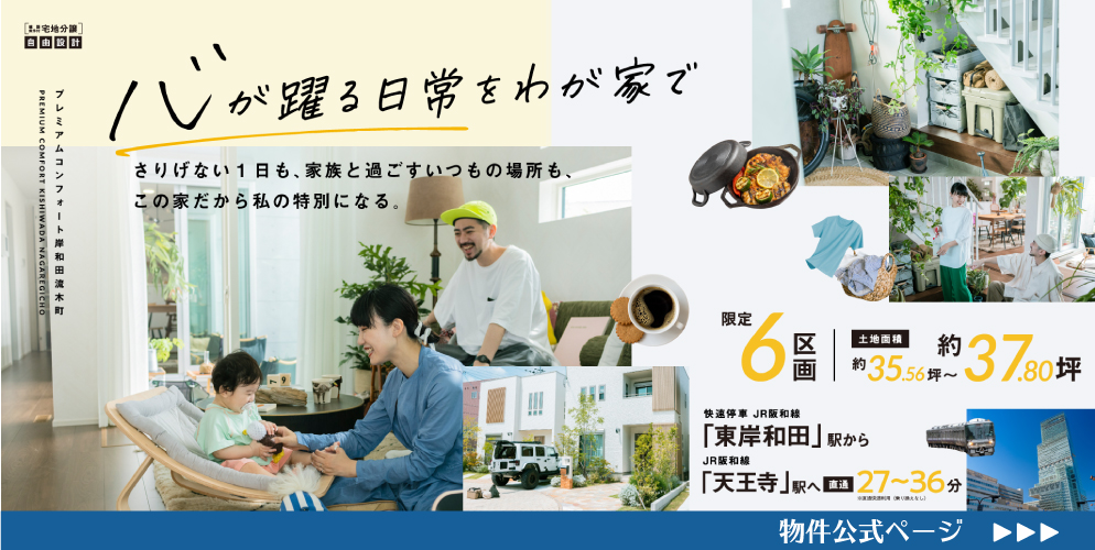 敷地面積約35坪~約37坪・全6区画の新コミュニティ「プレミアムコンフォート岸和田流木町」