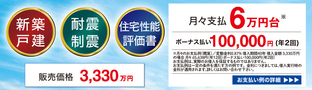 | 価格 | 3330万円 | 間取り | 3LDK+WIC SC+FC |