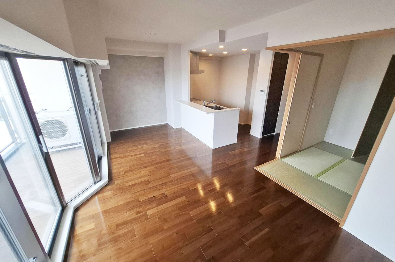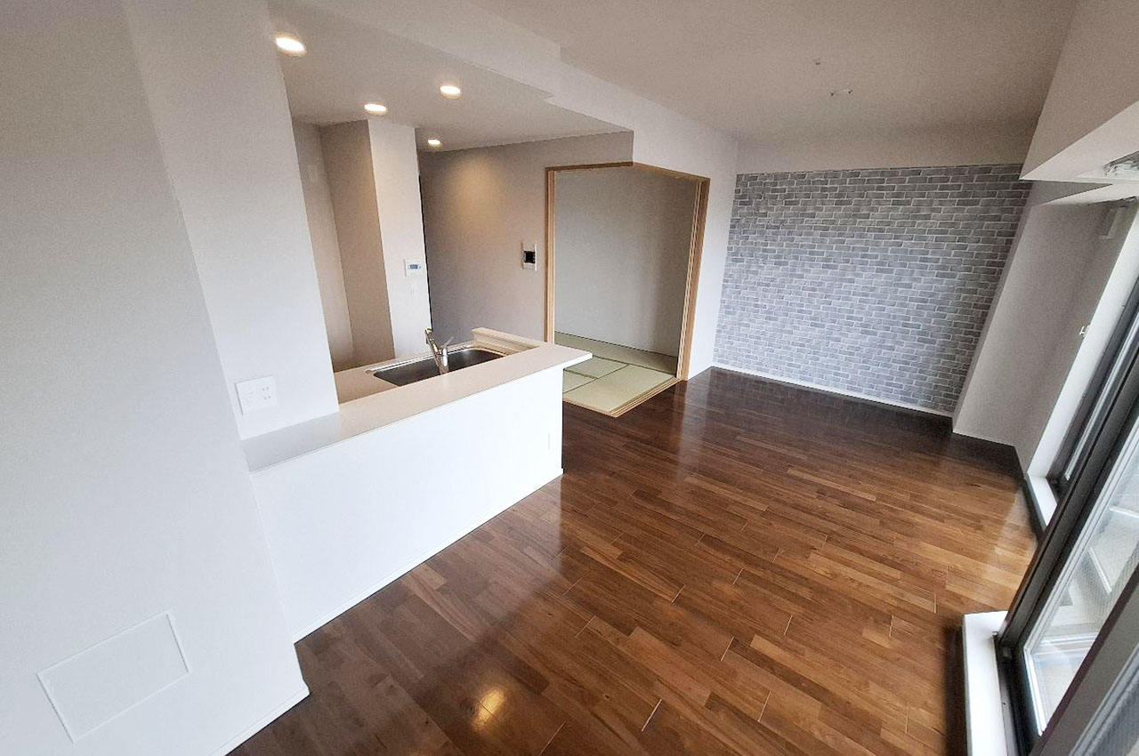 LDKに和室が隣接した、開放感のある間取り。家族団らんやキッズスペースなど多用途に使えます。