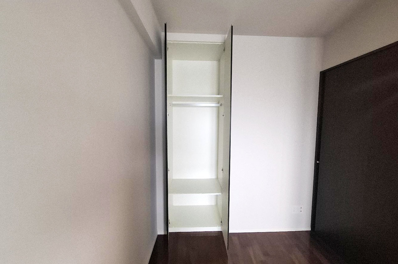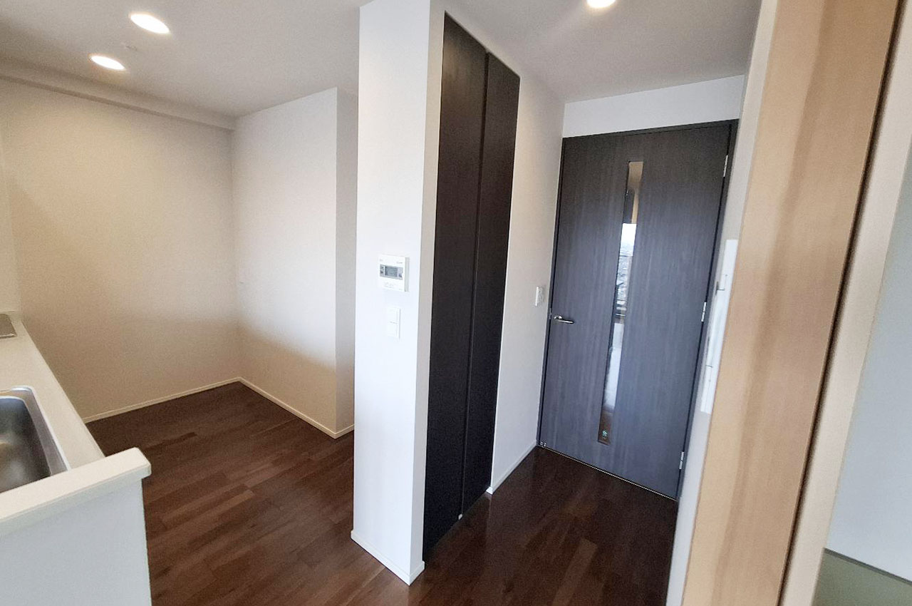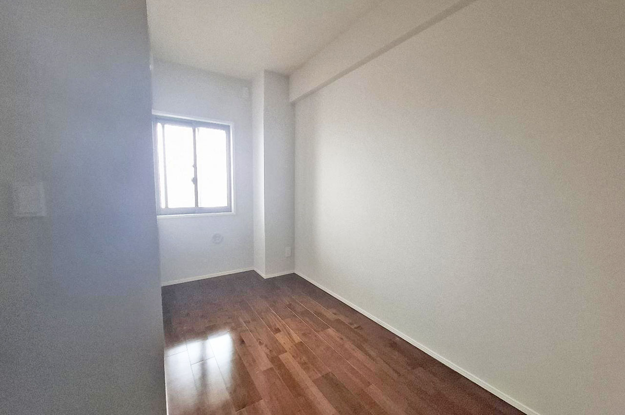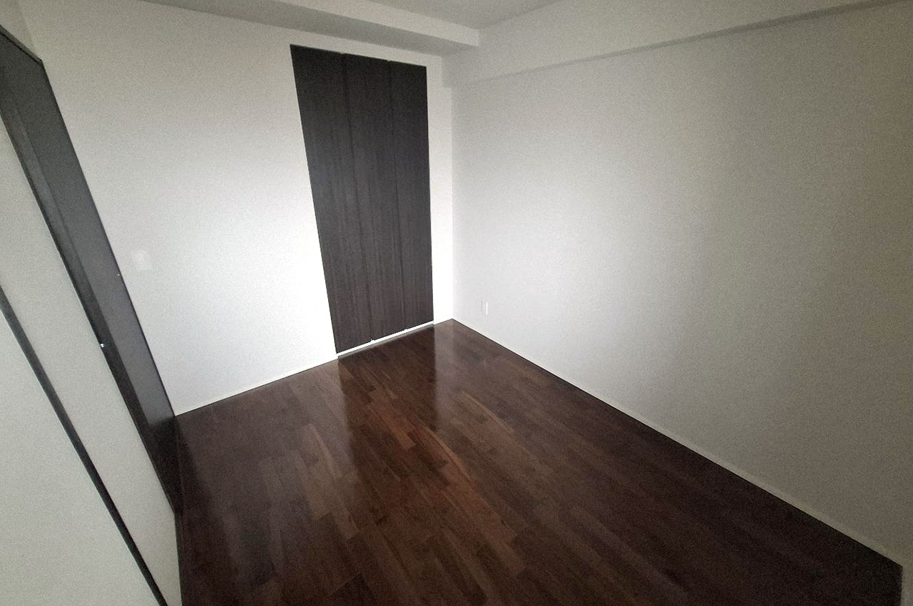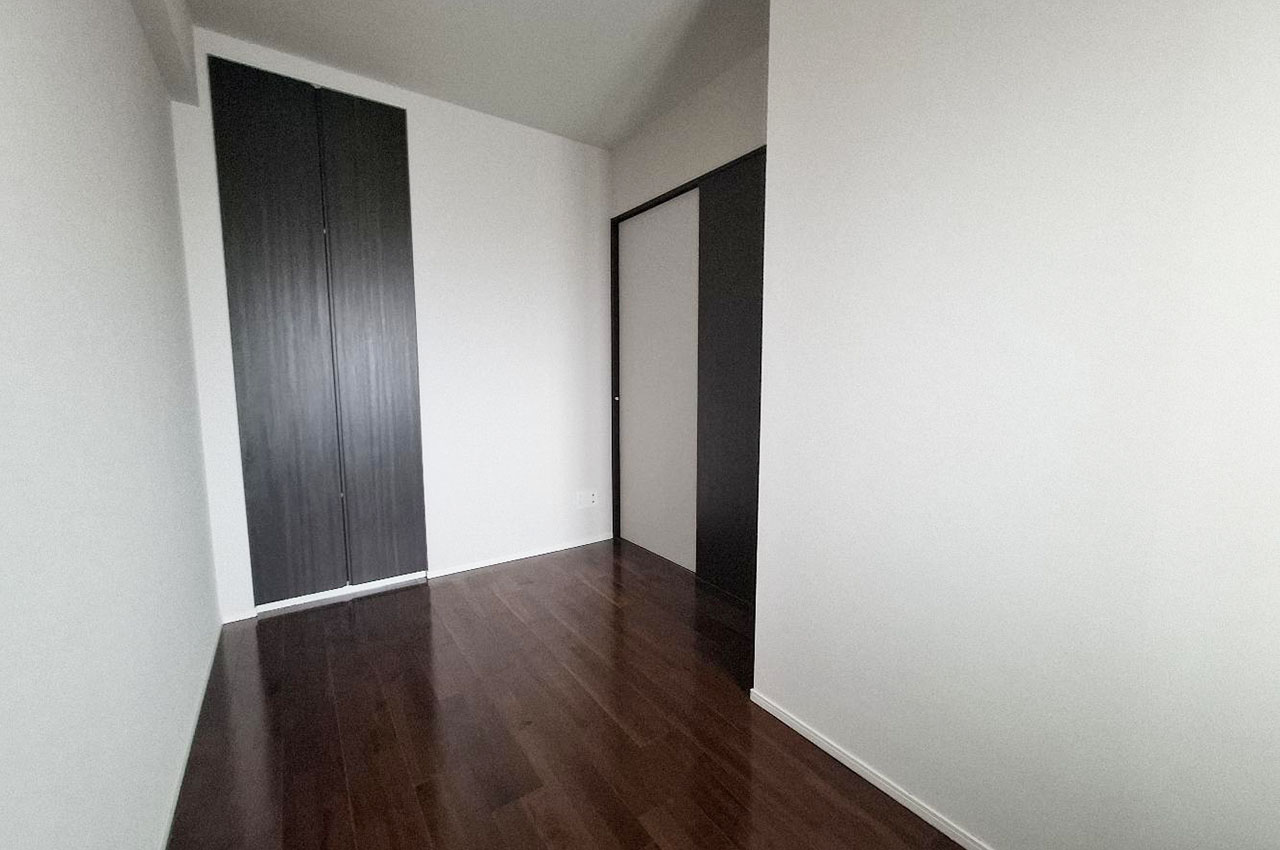 約5帖の洋室②。シンプルな内装とダークトーンの建具が落ち着きを演出します。