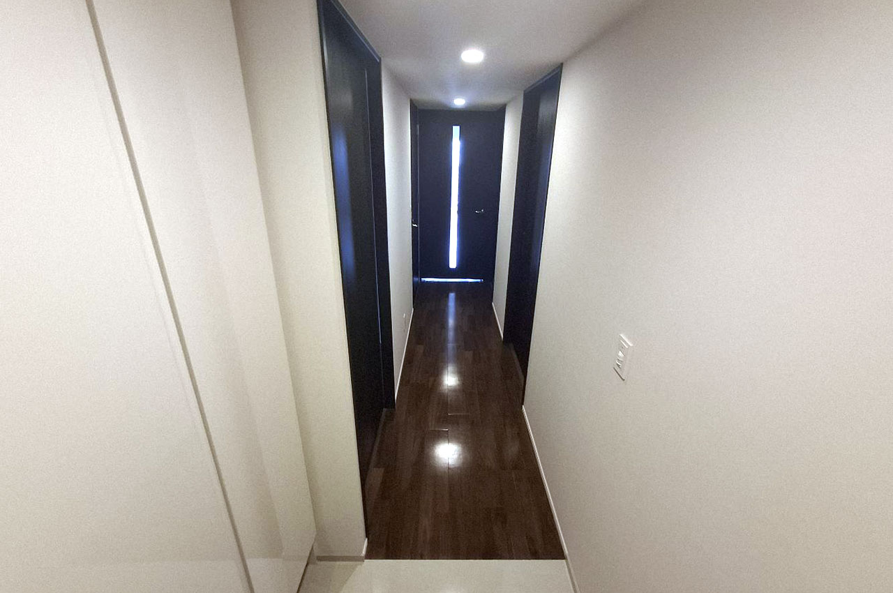 白とダークブラウンのコントラストが美しい廊下部分。高級感のある空間です。