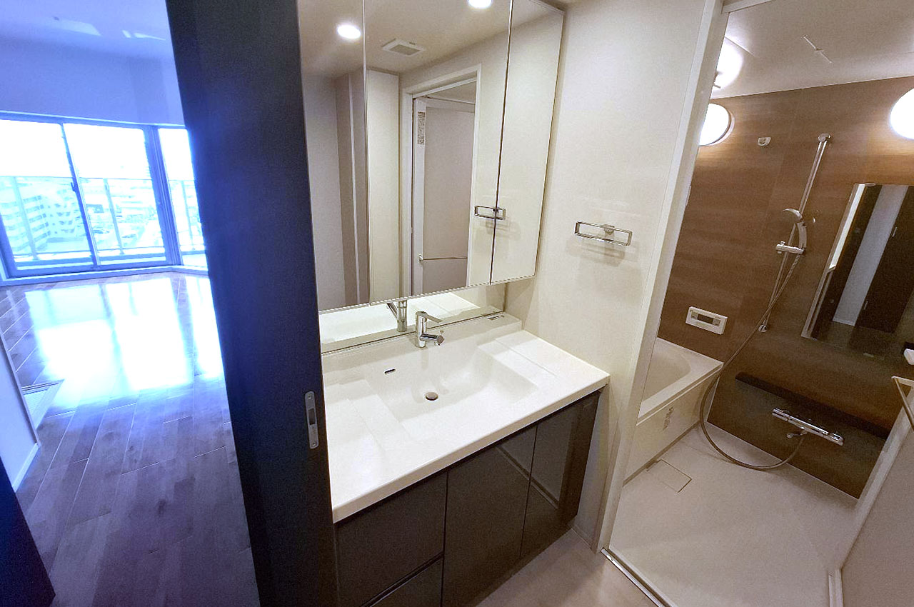 ワイドな三面鏡付きの洗面化粧台を備えた洗面室。朝の身支度も快適です。