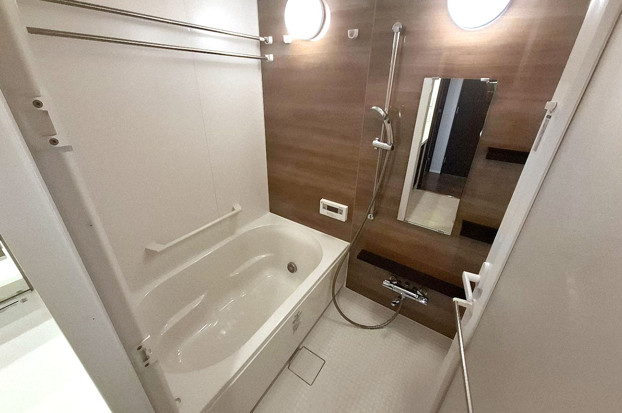 あたたかみのある木目調パネルのバスルーム。快適なバスタイムを実現する浴室乾燥機付きです。
