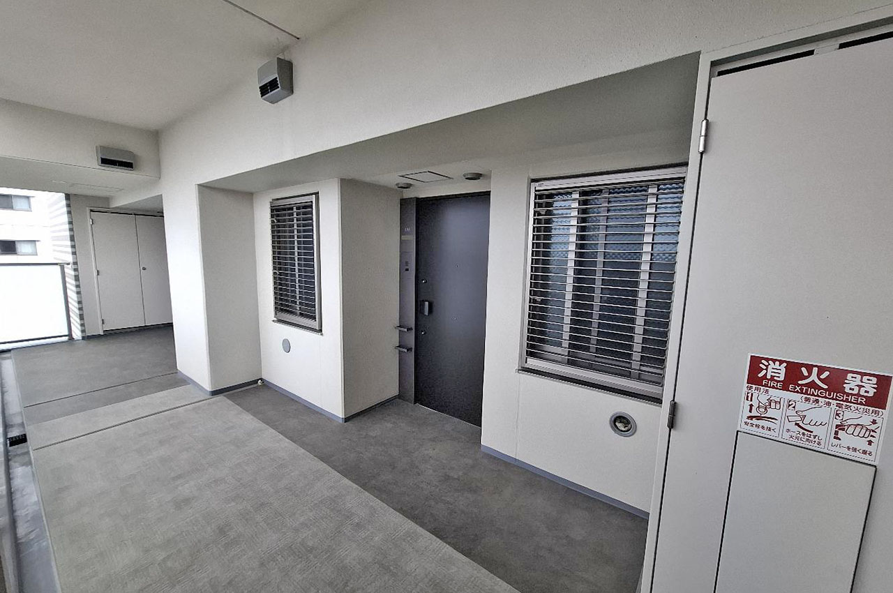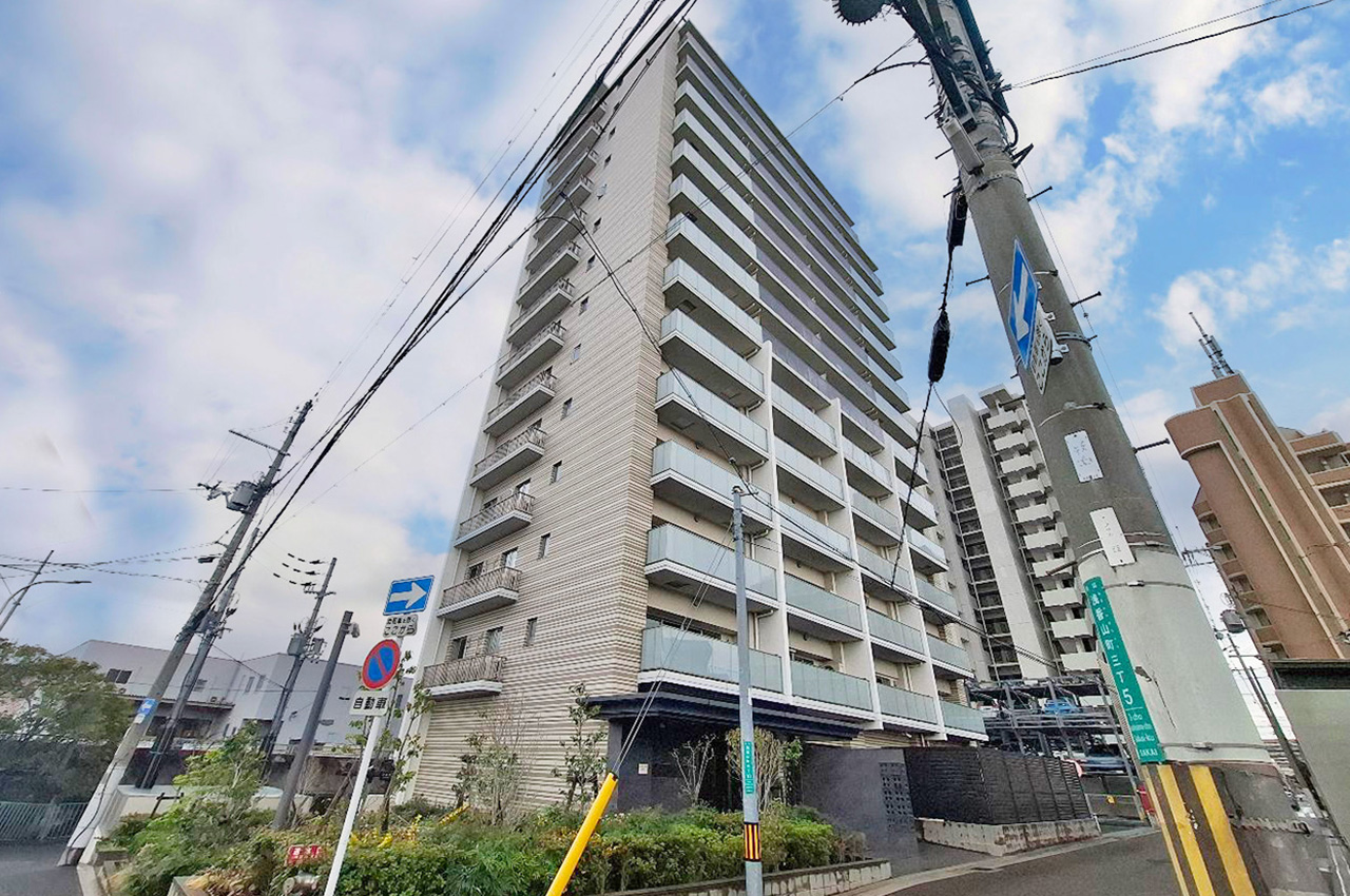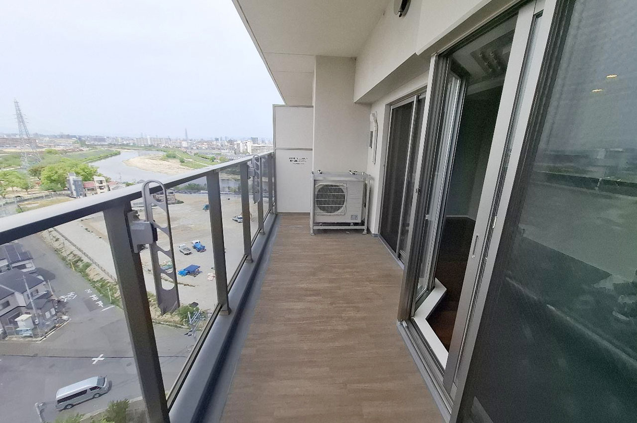 11階部分のバルコニーからの眺望。街並みと空を一望できる開放感あふれる景色です。