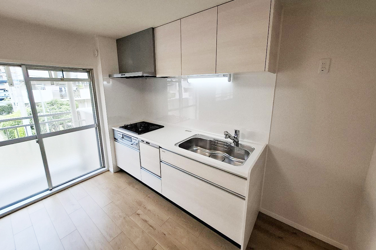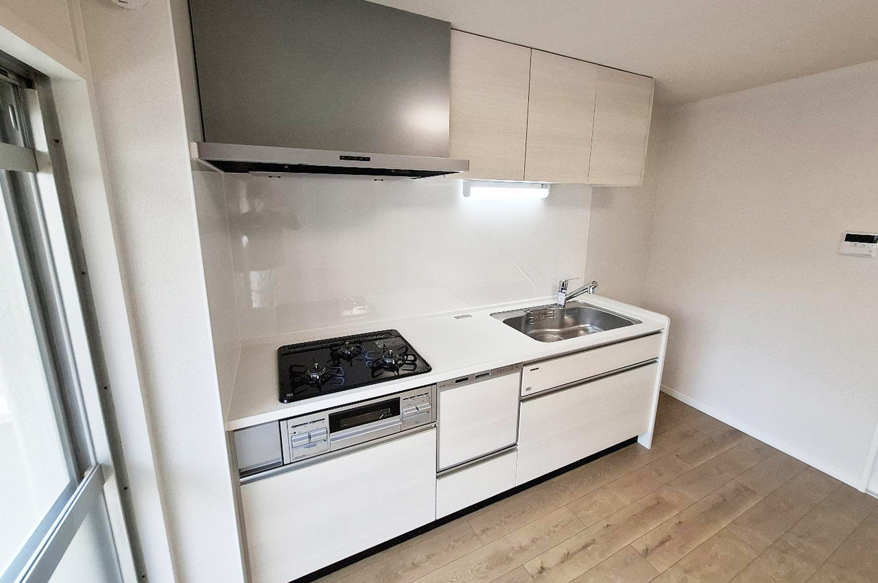 うれしい食洗機付きキッチンを新調。スペースを有効に使える壁付けタイプで、家事動線もスムーズです。
