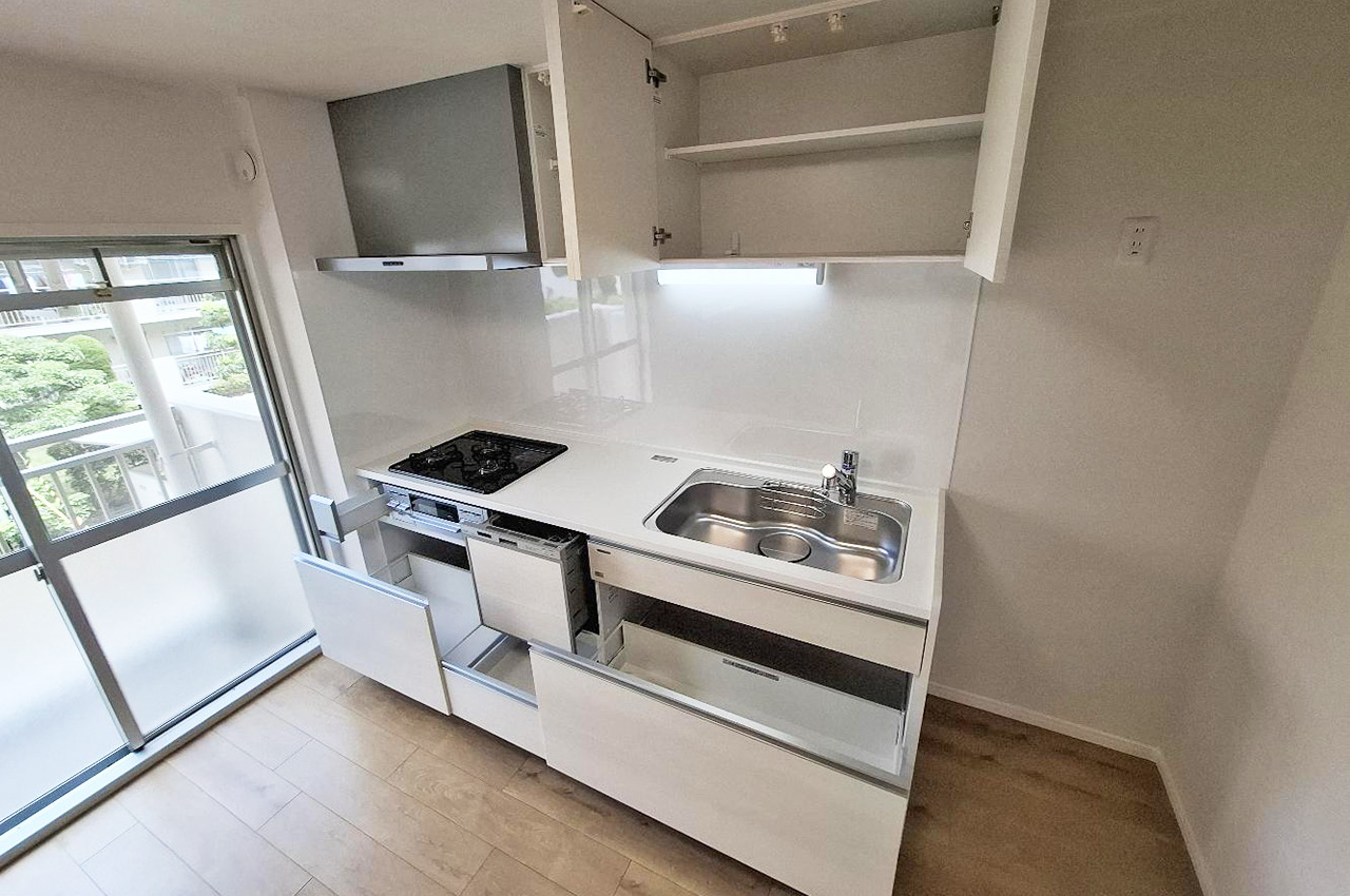 キッチンは上下に収納が充実。足元は出し入れもラクラクで収納力もあるスライドタイプです。