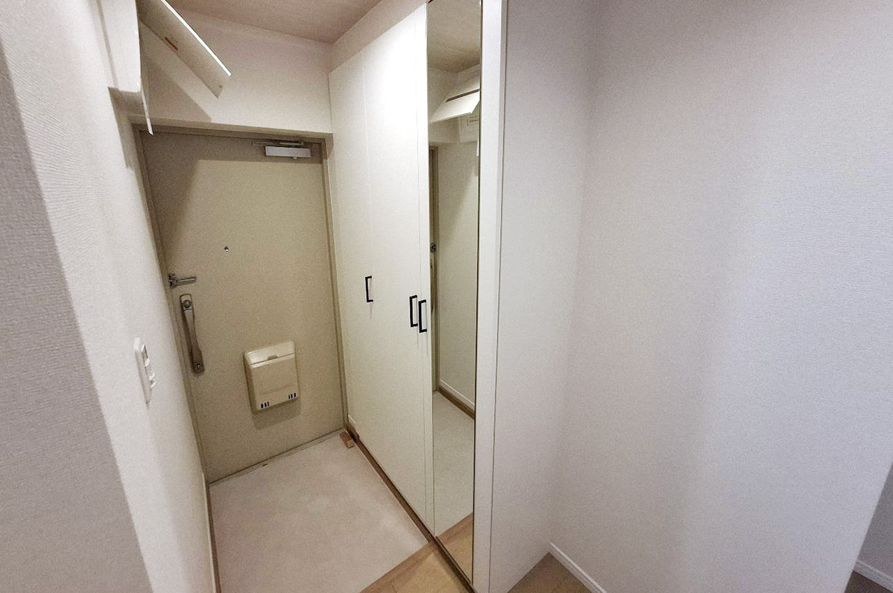 玄関周りはフルリフォームで清潔感あふれる空間に。姿見付きの下駄箱も新調済みです。