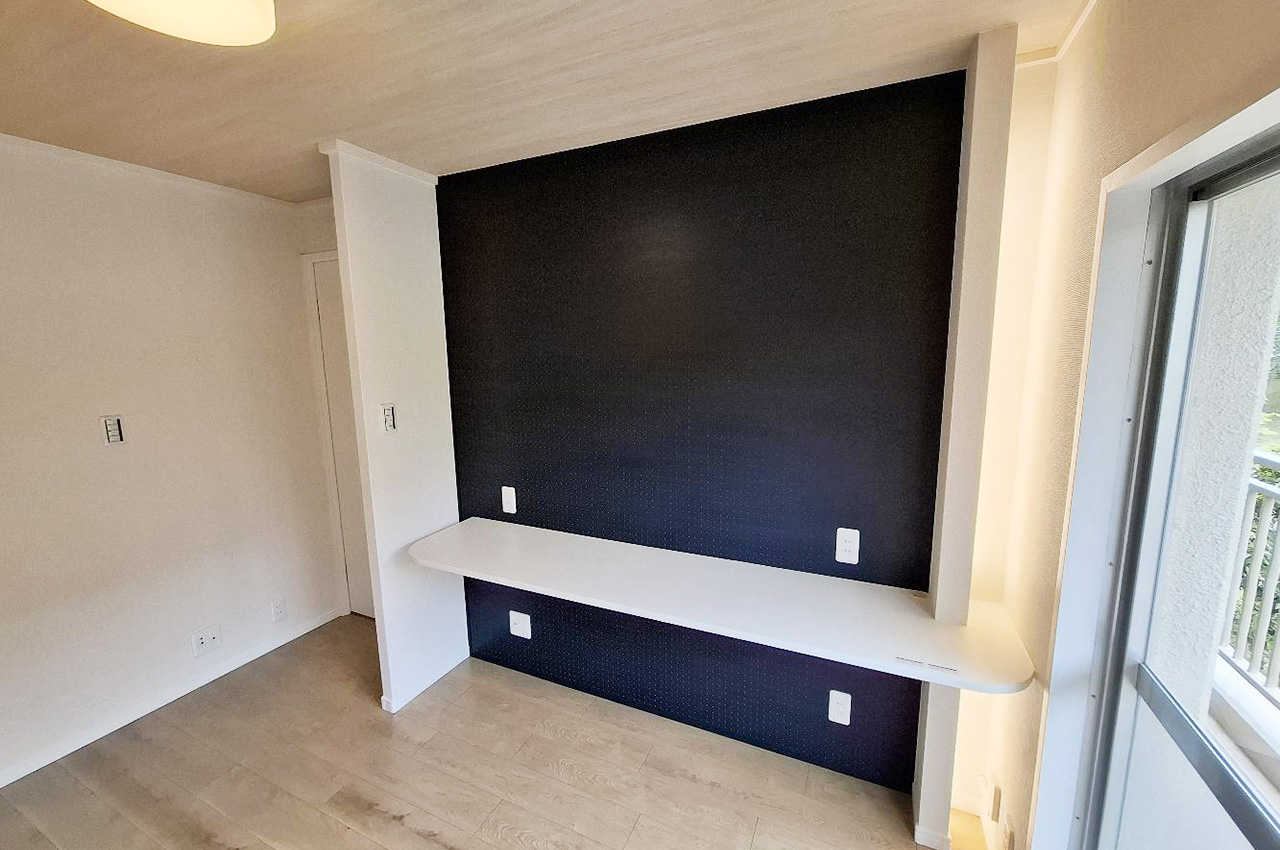 バルコニーに面した廊下部分の明るいスペース。カウンターと有孔化粧ボードを新設しました。