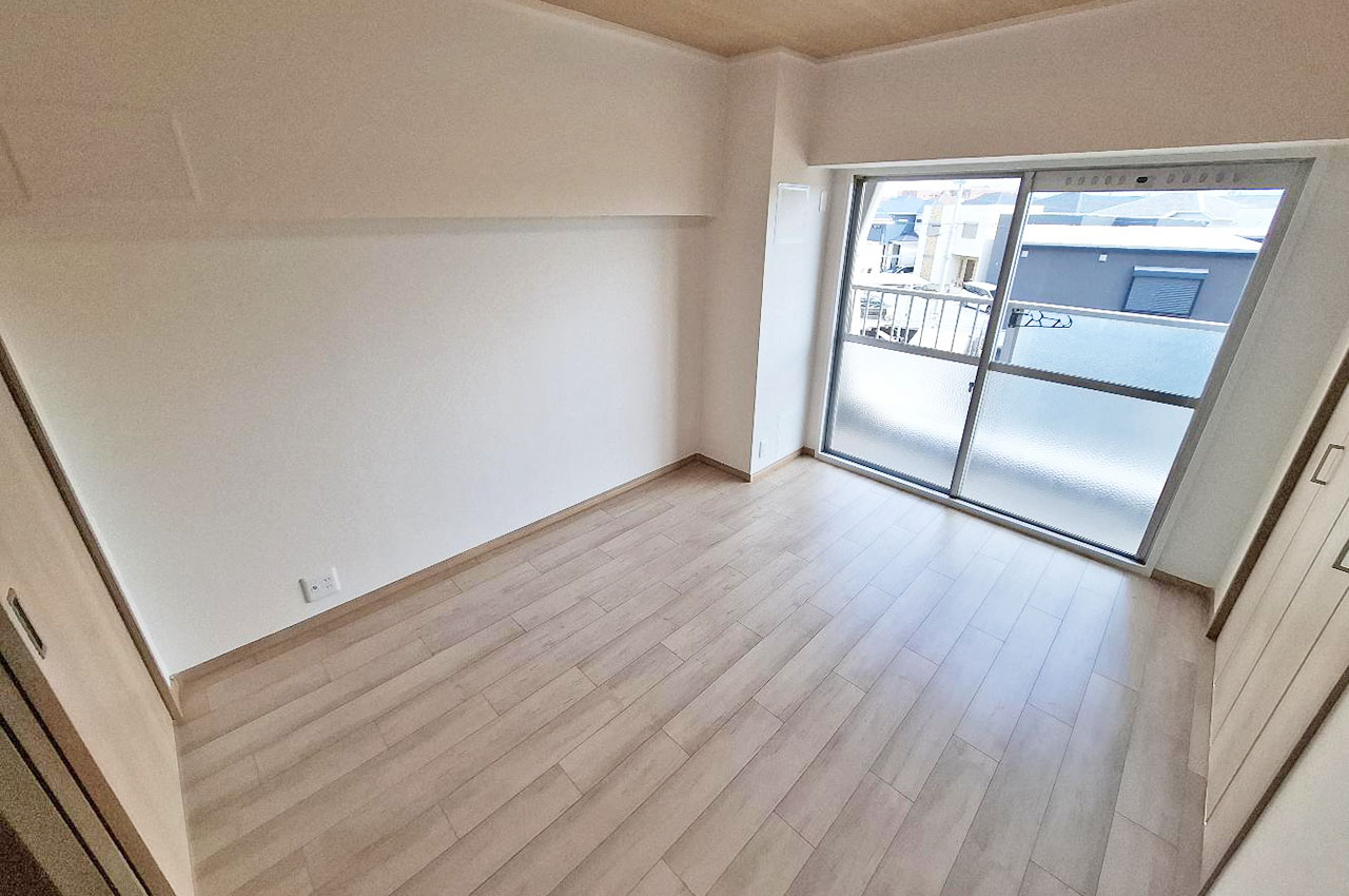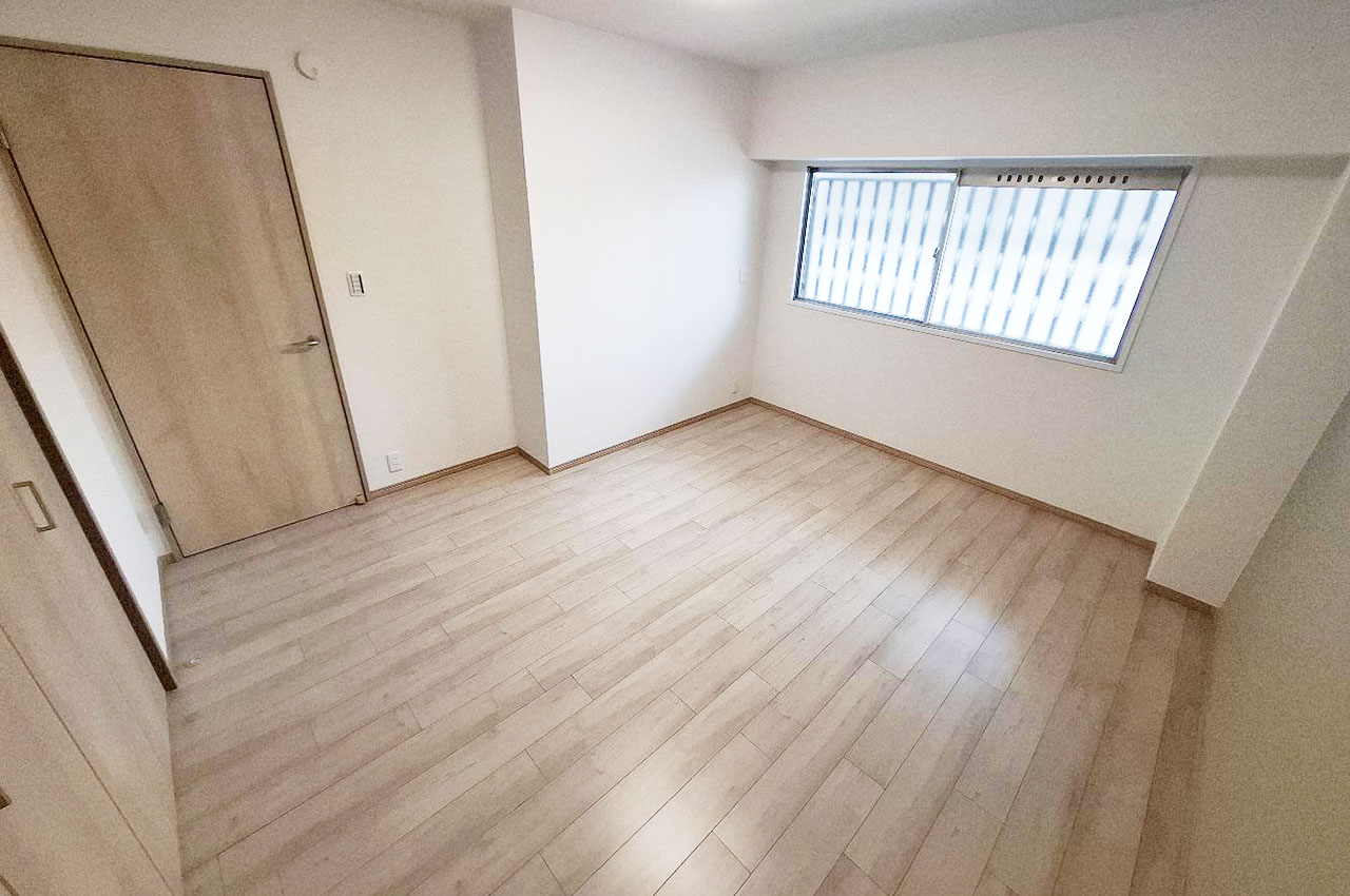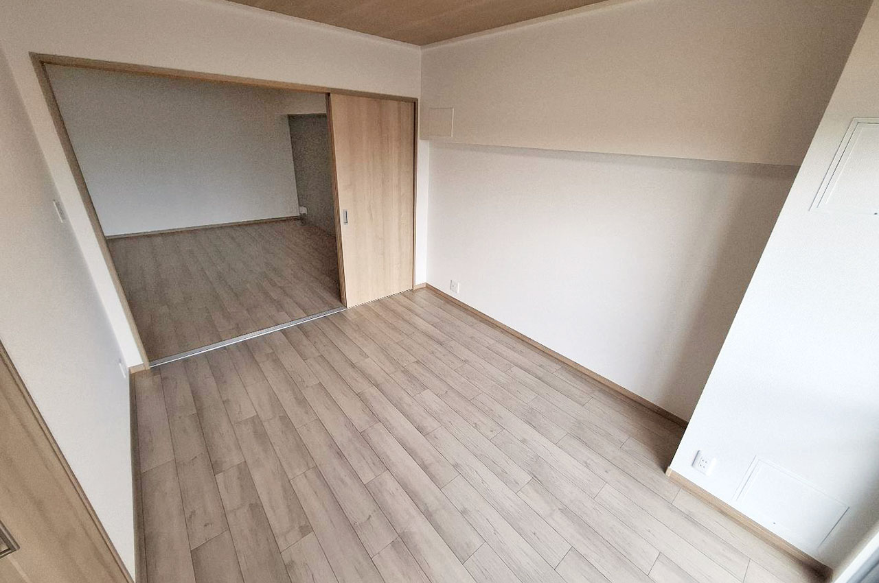 約8.4帖の洋室①。クロスやフローリング、入口建具もリフォームでまっさらに生まれ変わりました。