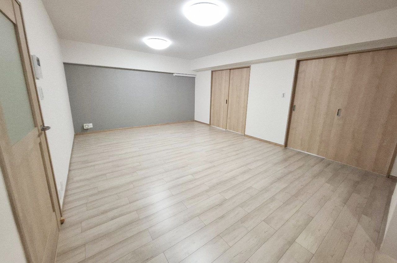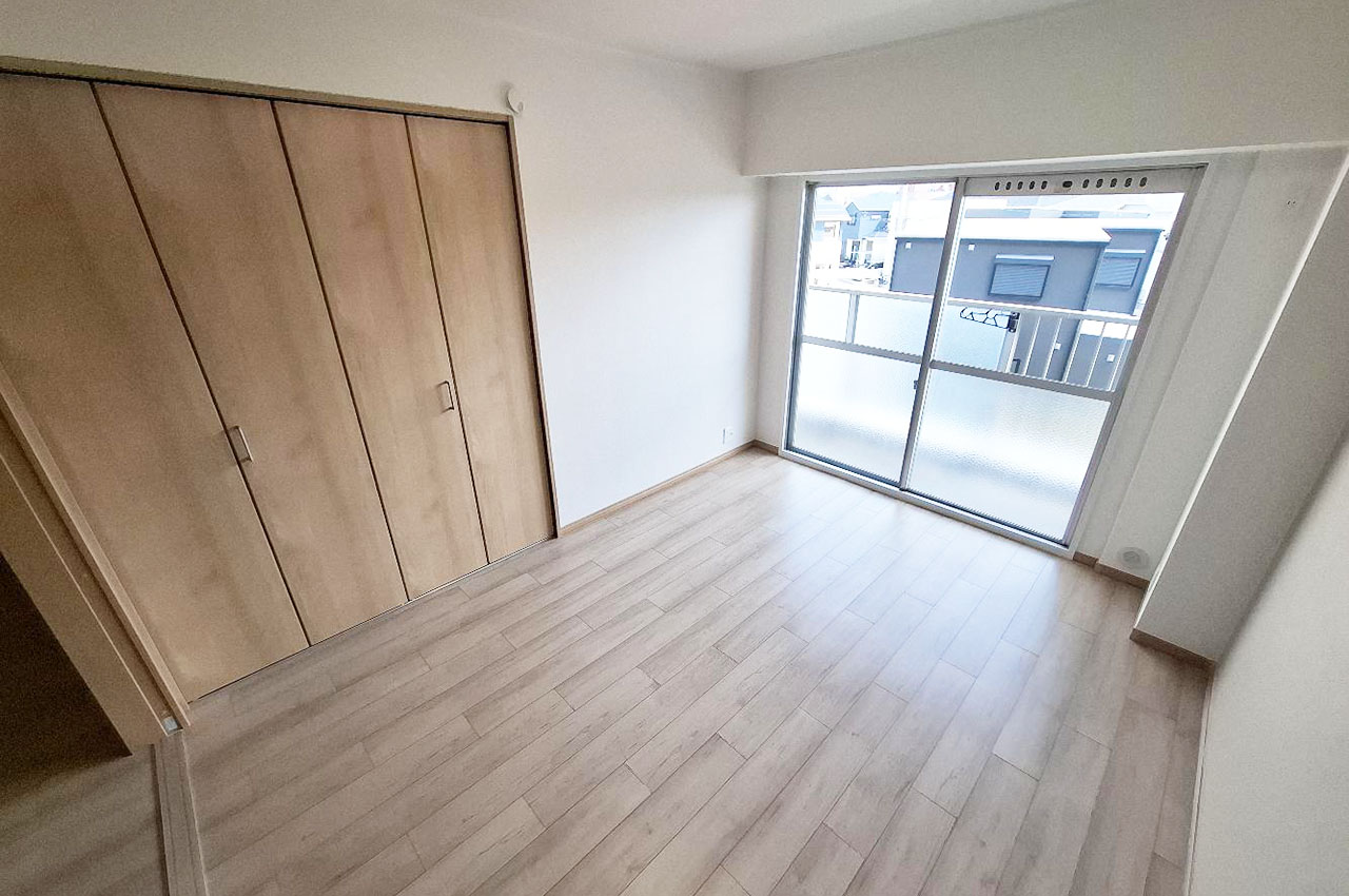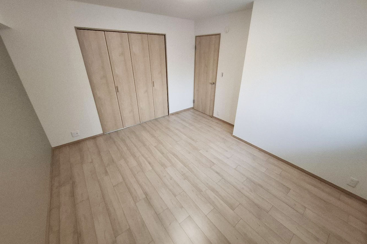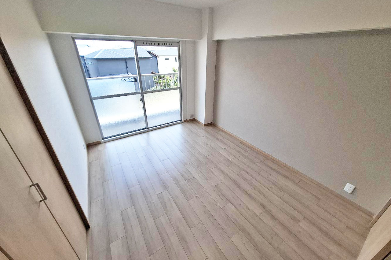 約8.4帖の洋室①。クロスやフローリング、入口建具もリフォームでまっさらに生まれ変わりました。