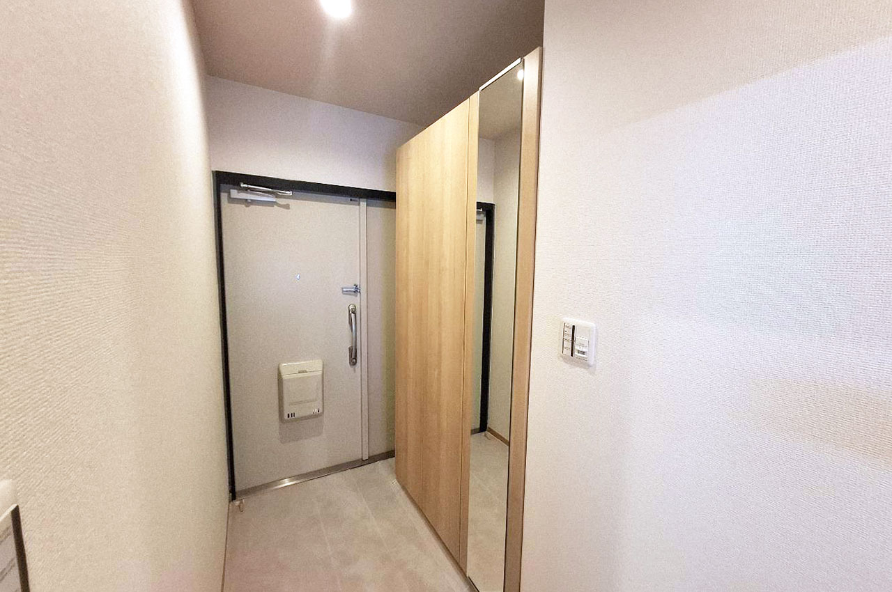 玄関には姿見付きで大容量の下駄箱を新調。収納力があり、空間に広がりも感じられます。