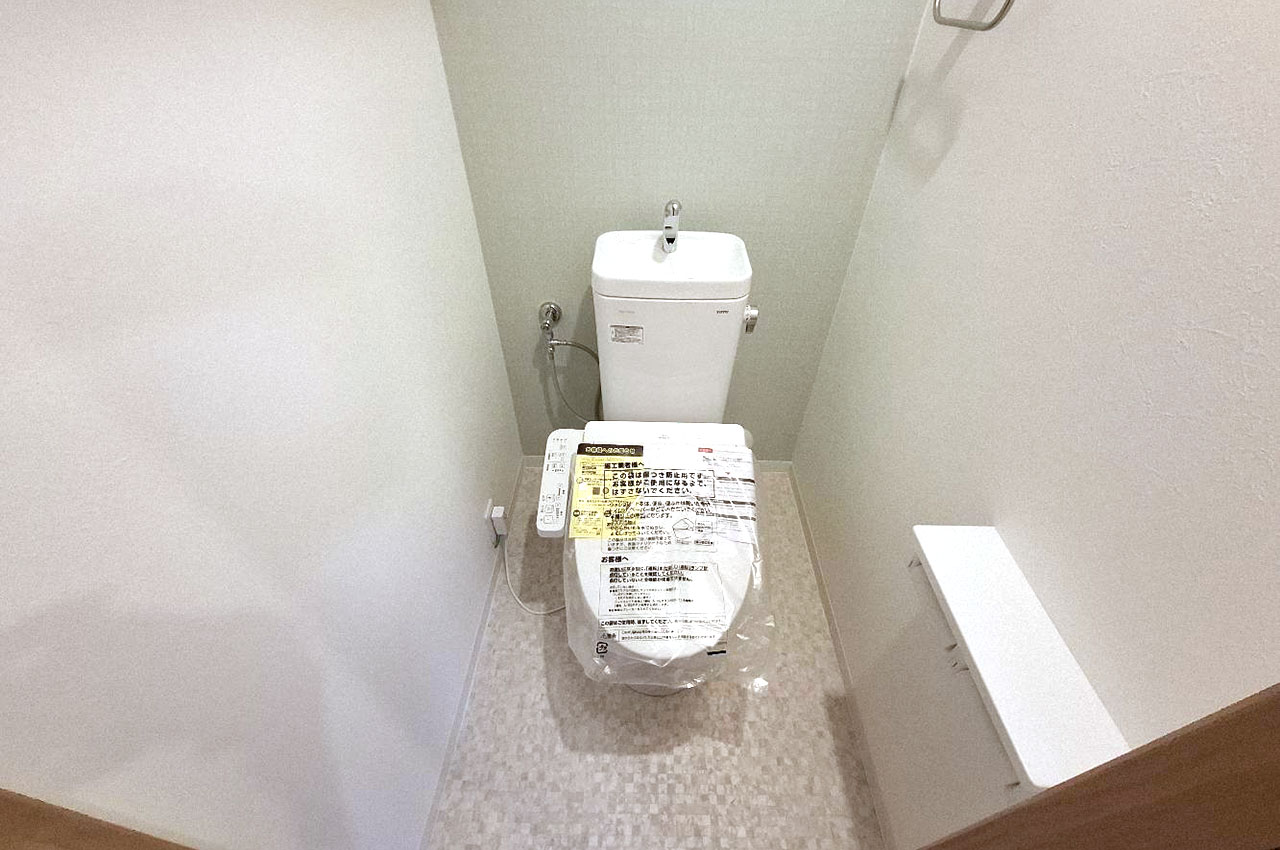 トイレ内もフルリフォームでまっさらに。爽やかなエレガントグリーンのアクセントクロスを貼りました。