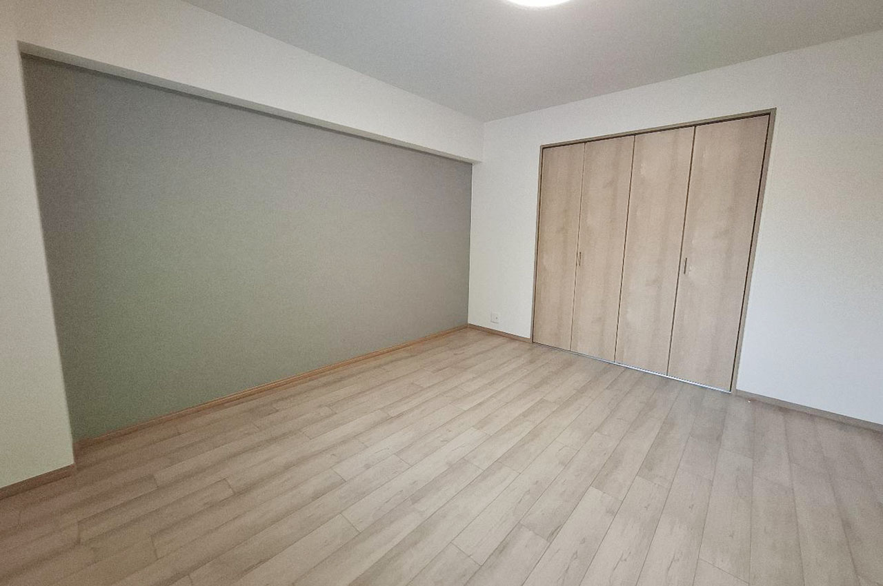 洋室①の壁一部には、落ち着いたグレーのアクセントクロスを施しました。