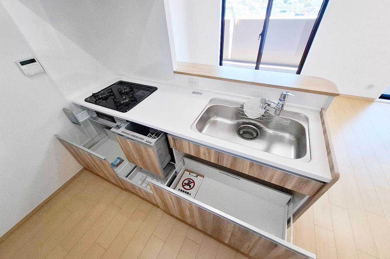 キッチン:木目調の扉が温かみを演出する新調済みのシステムキッチン。食洗機・浄水器付で家事効率アップ。