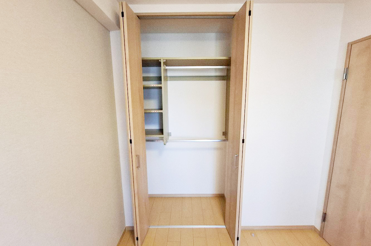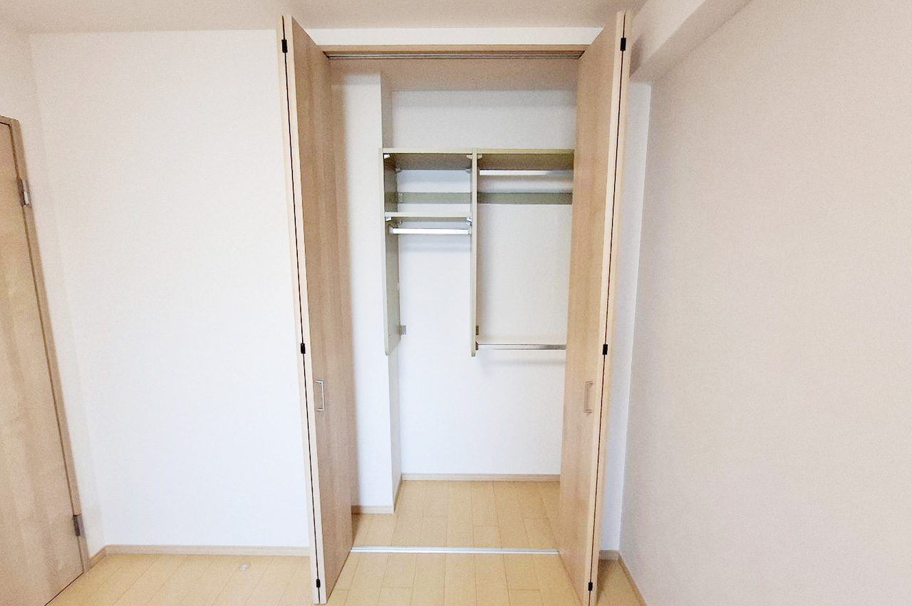 洋室①:クローゼットはハンガーパイプ付きで収納しやすい仕様。衣類をすっきり片付けられます。