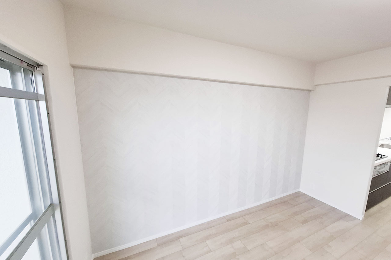 DK:壁の一部をアクセントクロスに貼替え、モダンな空間を演出。