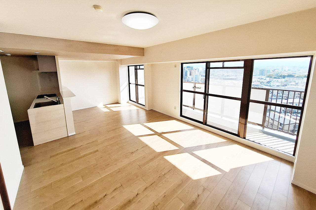 LDK:13階部分、南向きバルコニーに面しており日当り良好。
