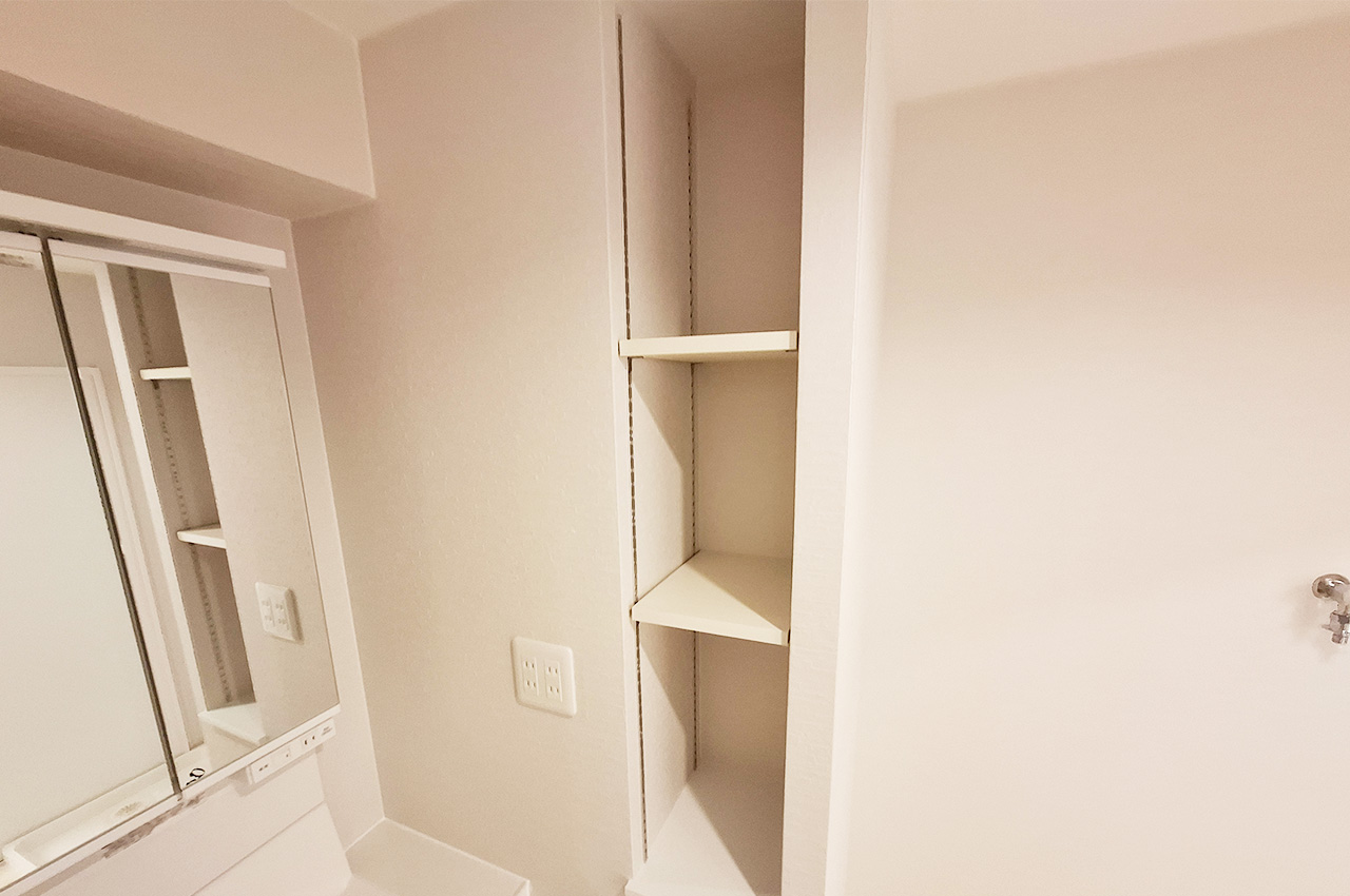 洗面室:洗面化粧台横には収納棚があり便利です。