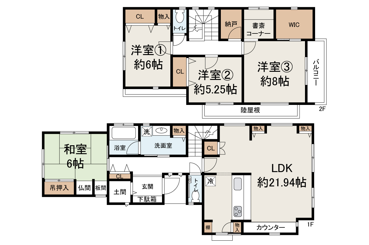 | 設備・特徴 | 電気 公営水道 都市ガス 個別浄化槽 定額リフォーム(オプション) アフターサービス保証付 収納多し 全居室収納あり LDK16帖以上 ゆとりの4LDK 普通車1台軽1台駐車OK トイレ2ヶ所 急行停車駅 太陽光発電システム 食洗機 床暖房 浴室乾燥機 カウンターキッチン 勝手口あり ウォークインクローゼット 納戸 | ||