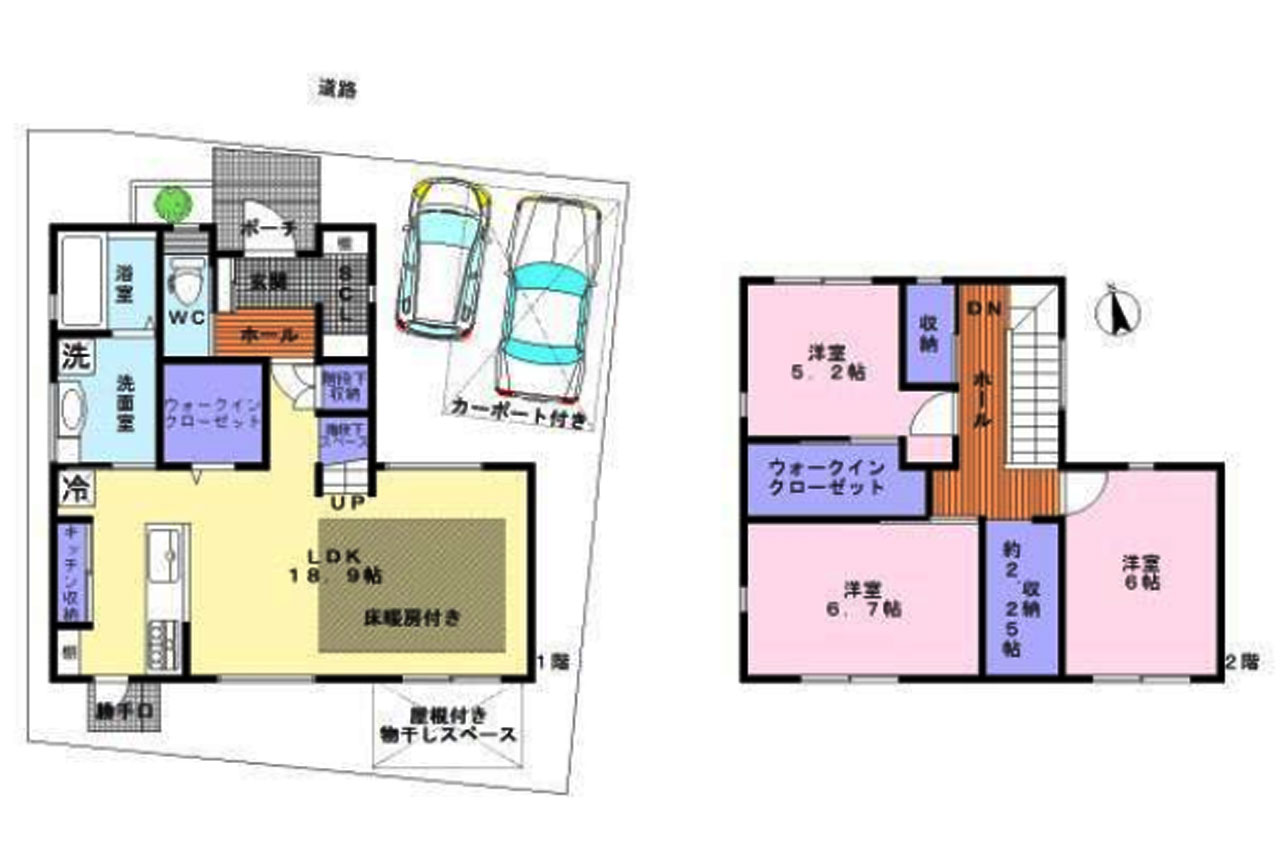 設備・特徴 | 電気 公営水道 都市ガス 公共下水 収納多し LDK16帖以上 全居室洋室 築浅 駐車2台OK リビング階段 快速停車駅 買物便利 床暖房 浴室乾燥機 対面キッチン 勝手口あり ウォークインクローゼット シューズクローク パントリー カーポート | ||