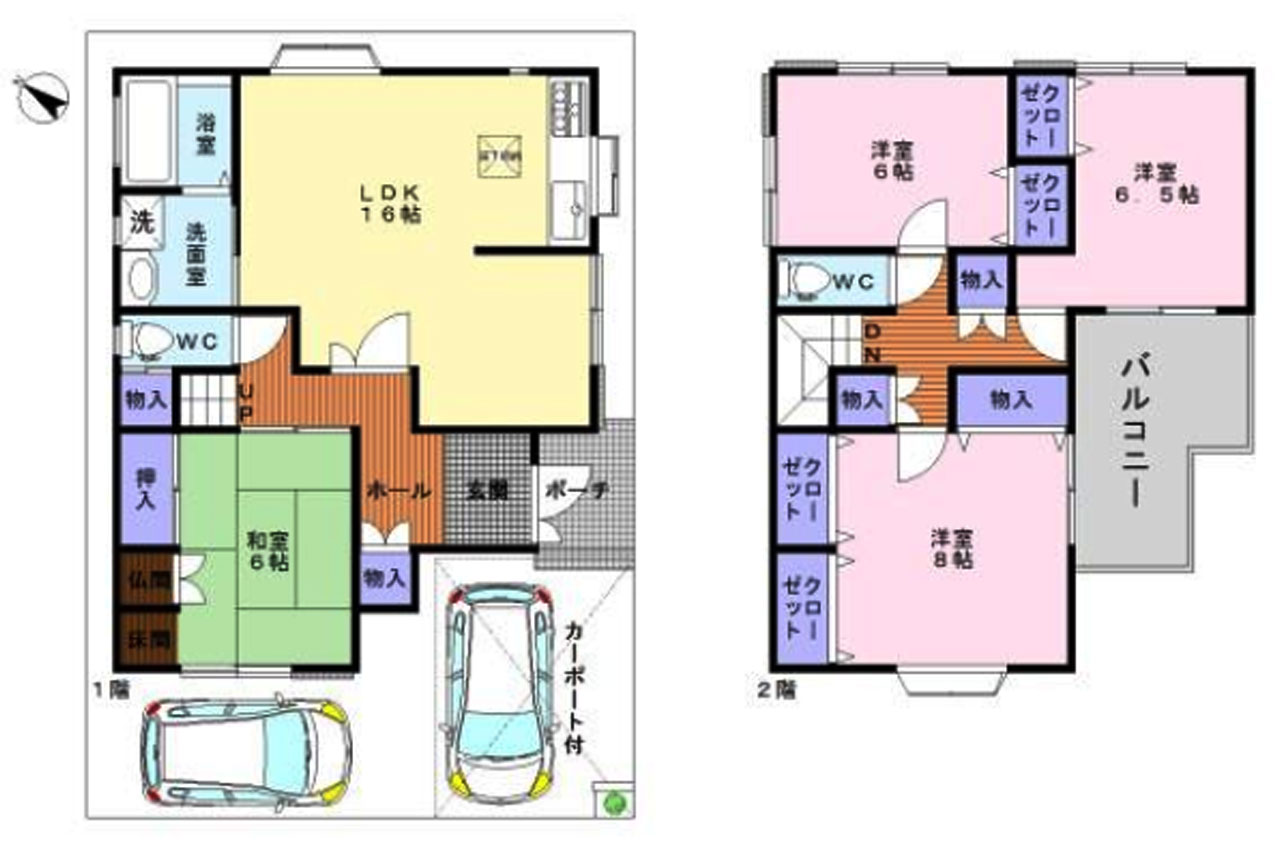 | 設備・特徴 | 公営水道 オール電化 公共下水 IHコンロ 収納多し 全居室収納あり LDK16帖以上 ゆとりの4LDK 駐車2台OK トイレ2ヶ所 全居室6帖以上 学校近し 買物便利 前面道路6m以上 太陽光発電システム 食洗機 ダブルクローゼット カーポート | ||