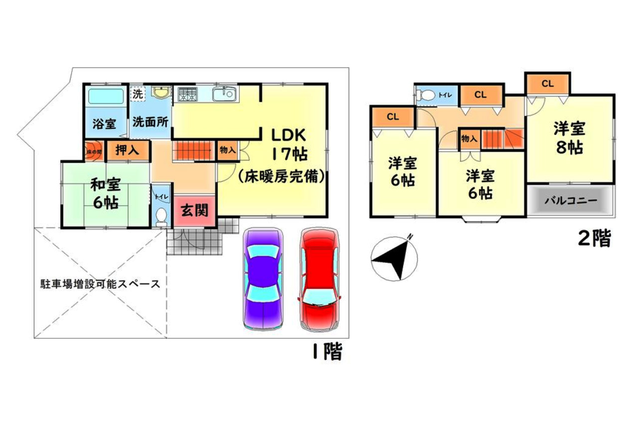 設備・特徴 | 公営水道 都市ガス 公共下水 全居室収納あり LDK16帖以上 ゆとりの4LDK 駐車2台OK トイレ2ヶ所 全居室6帖以上 急行停車駅 学校近し 土地広 食洗機 床暖房 浴室乾燥機 壁付キッチン | ||