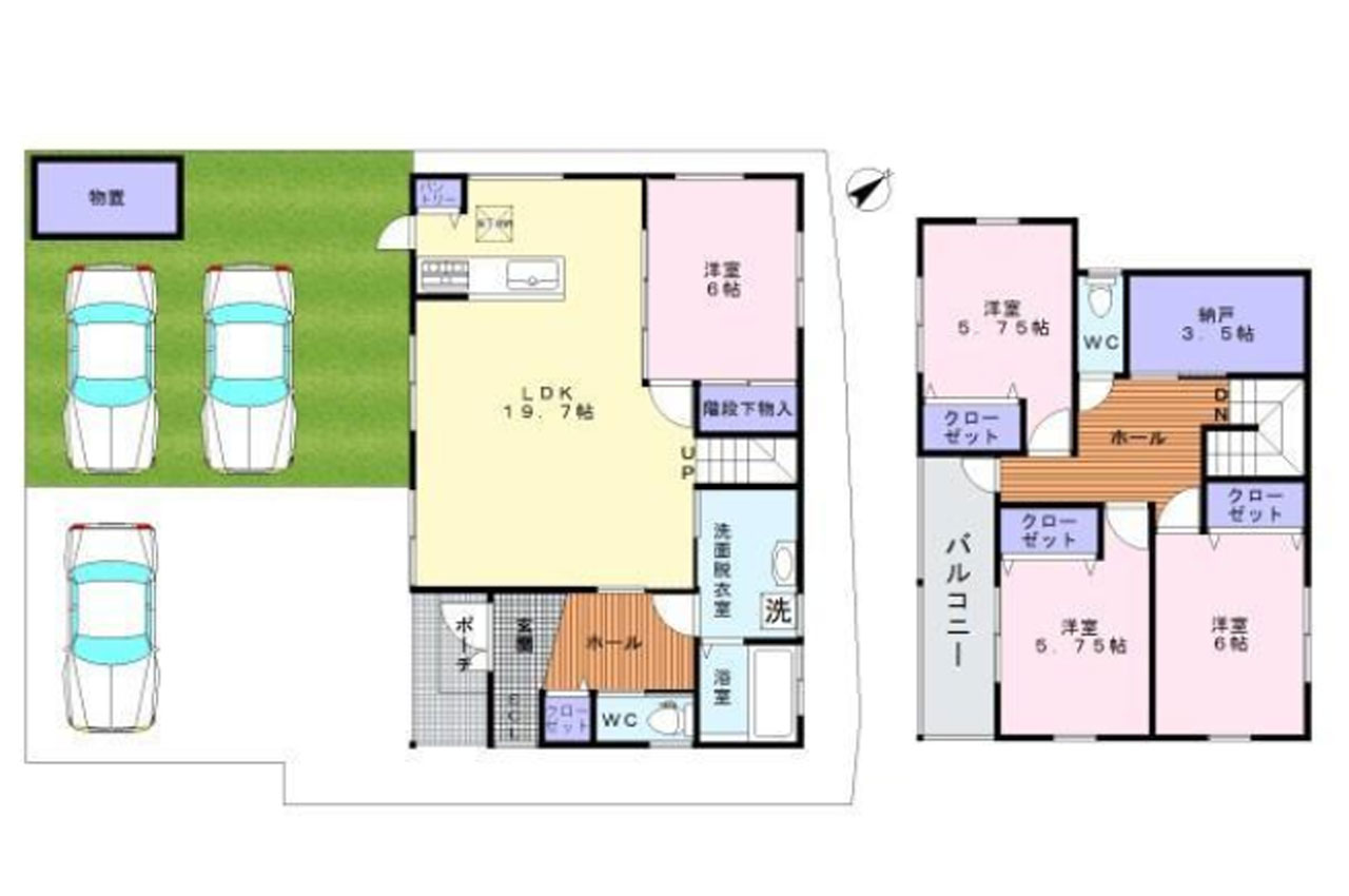 設備・特徴 | 電気 公営水道 都市ガス 個別浄化槽 全居室収納あり LDK16帖以上 ゆとりの4LDK 全居室洋室 築浅 駐車3台以上OK リビング階段 トイレ2ヶ所 庭 駅近 学校近し 買物便利 日当良好 土地広 前面道路6m以上 浴室乾燥機 対面キッチン 勝手口あり シューズクローク 納戸 | ||