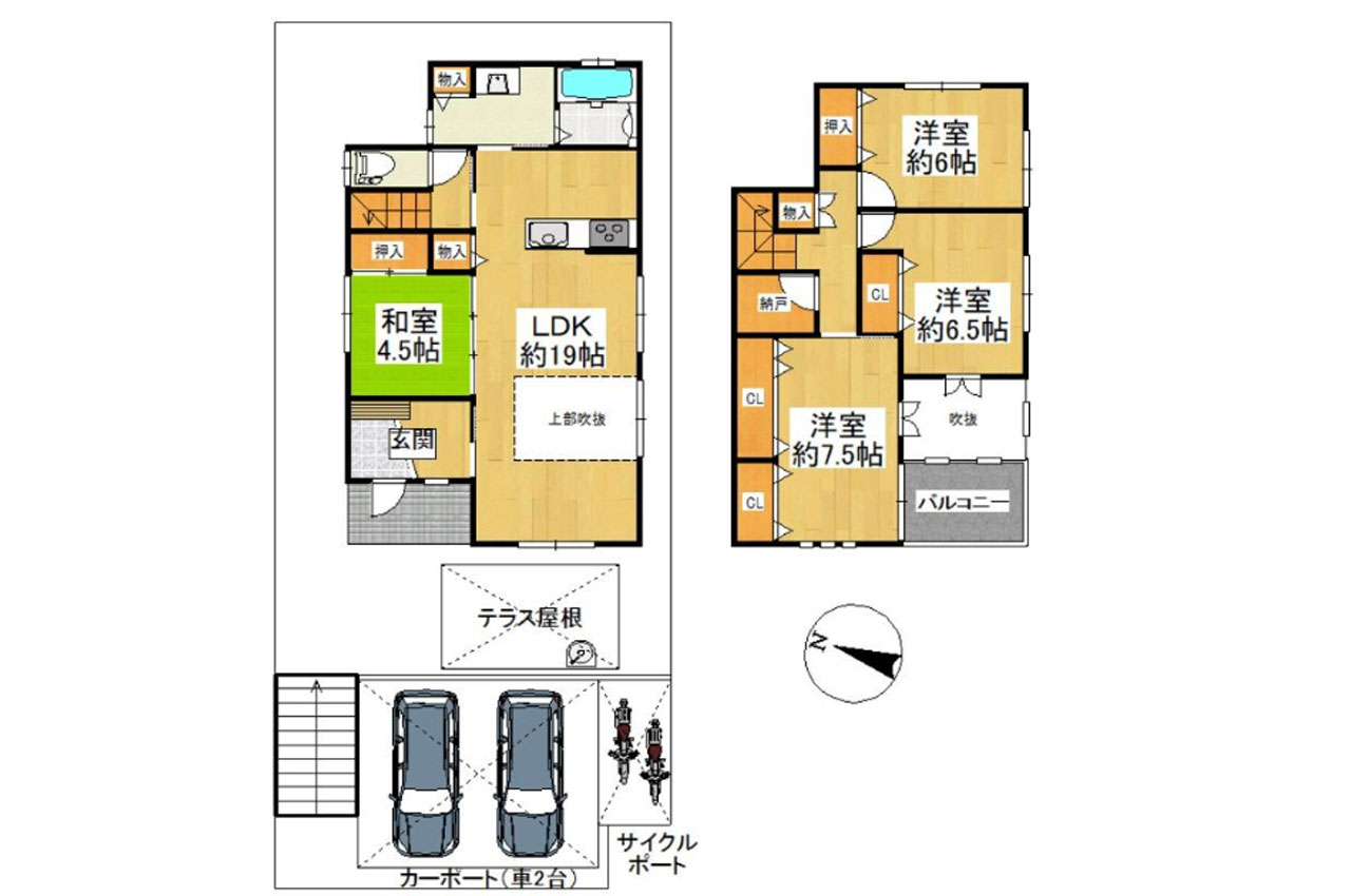 | 設備・特徴 | 電気 公営水道 オール電化 公共下水 IHコンロ 収納多し 全居室収納あり LDK16帖以上 ゆとりの4LDK 炭の家 駐車2台OK 庭 複層ガラス 公園近く 日当良好 閑静な住宅地 大きな住宅地 土地広 前面道路6m以上 浴室乾燥機 対面キッチン 吹抜 納戸 カーポート | ||