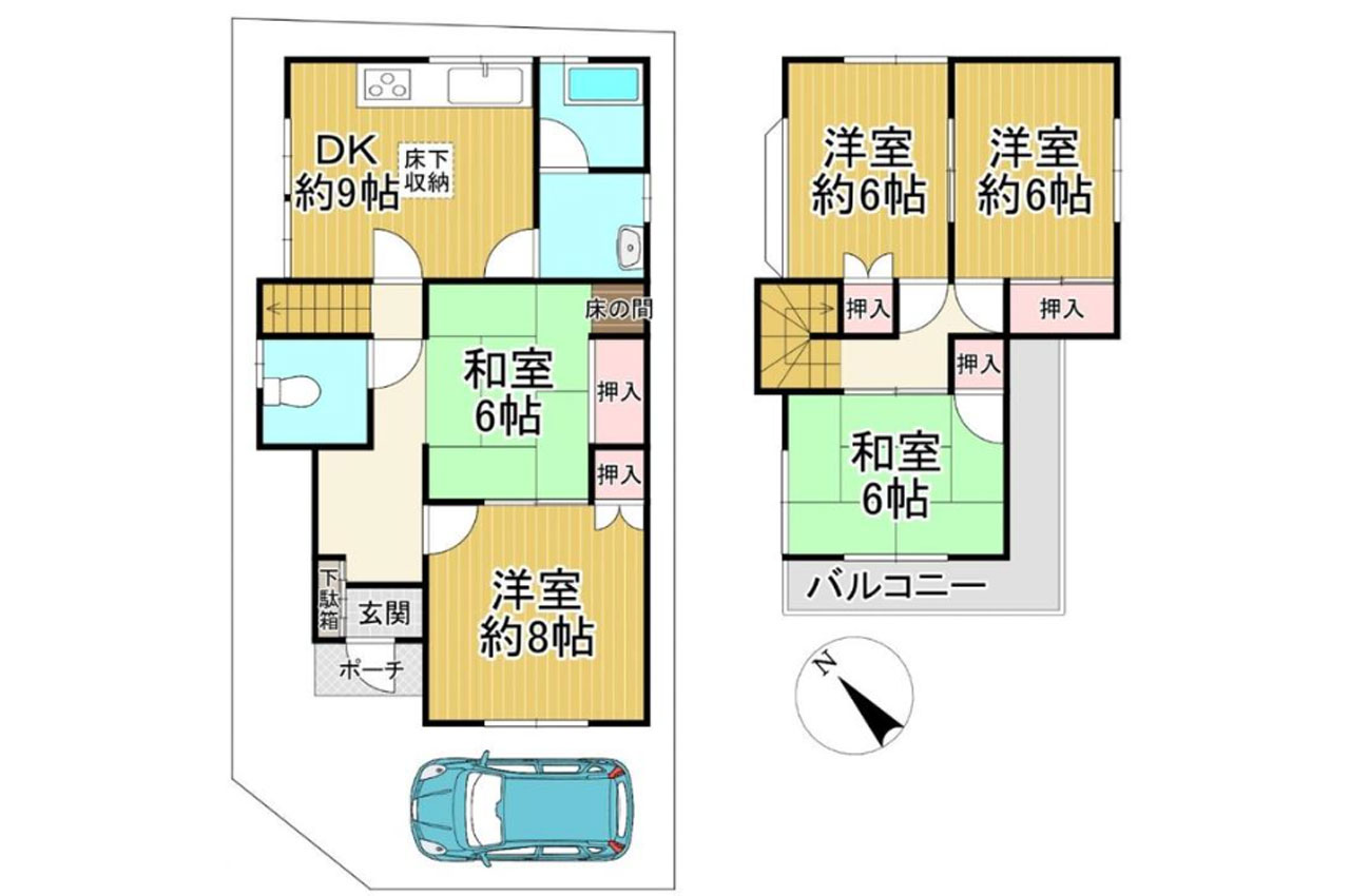 | 設備・特徴 | 電気 公営水道 都市ガス 汲取 全居室収納あり 即引渡可 駐車スペースあり 2面バルコニー 急行停車駅 買物便利 公園近く 角家 壁付キッチン | ||