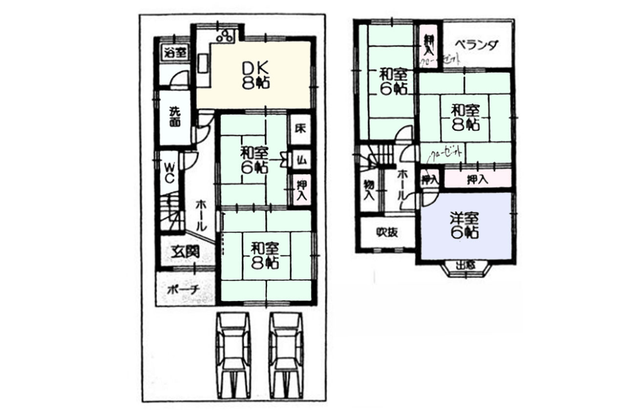 | 設備・特徴 | 電気 公営水道 都市ガス 個別浄化槽 和室続間 即引渡可 駐車2台OK 全居室6帖以上 駅近 閑静な住宅地 L型キッチン 吹抜 カーポート | ||