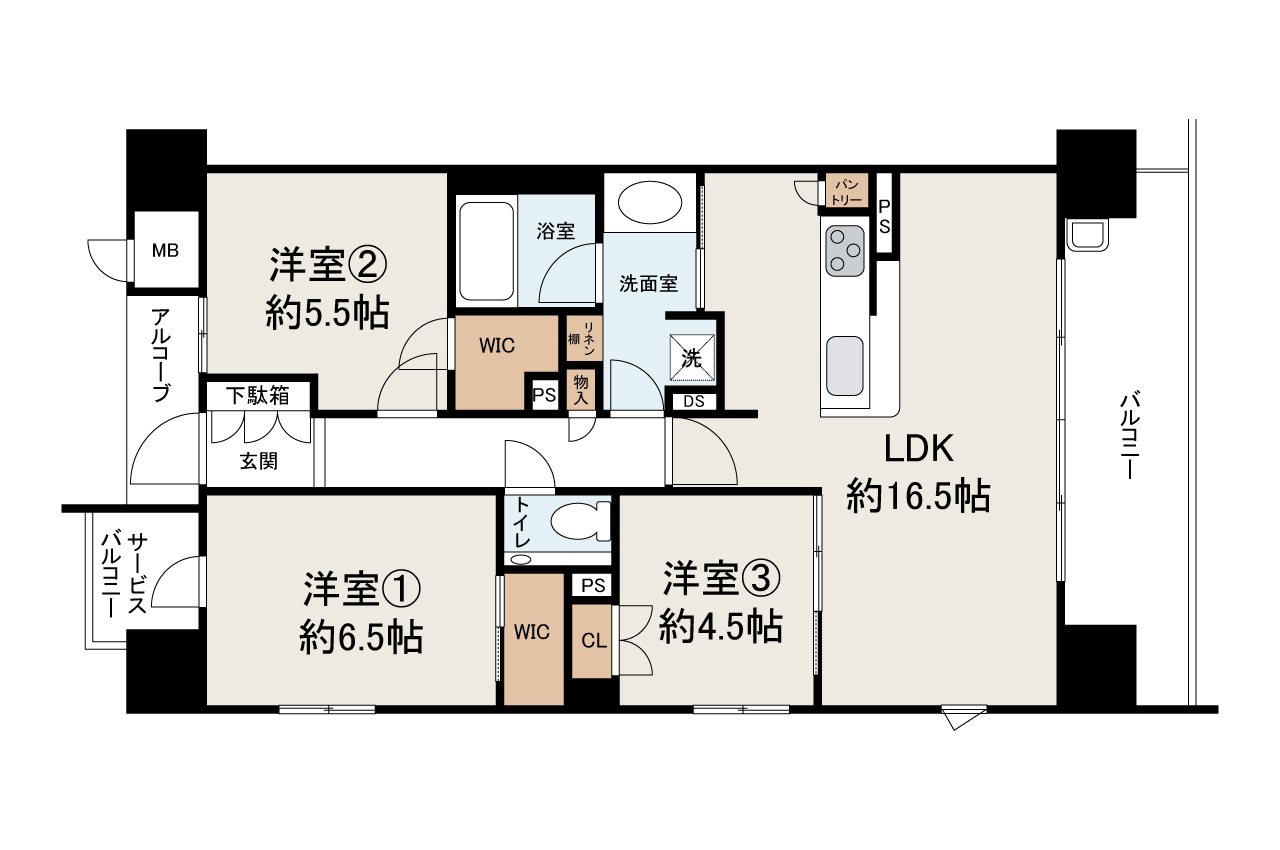 柱型のでっぱりのないアウトポールの広々3LDK