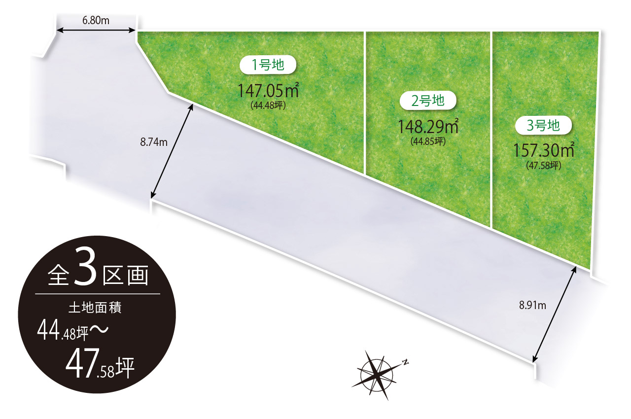 ・南東側幅員約8.74m~8.91m、南西側幅員約6.8mの市道に面した全3区画の街!