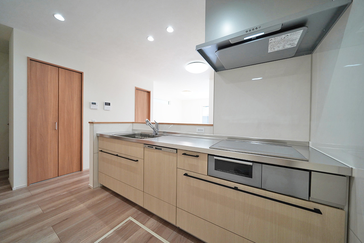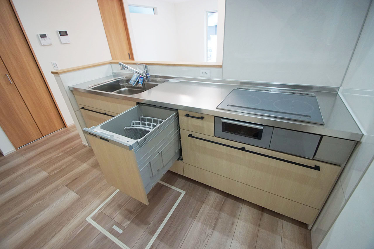 手洗いよりキレイに洗えて節水にもなる食洗機付きのキッチン。忙しい家事の時短にもなります。