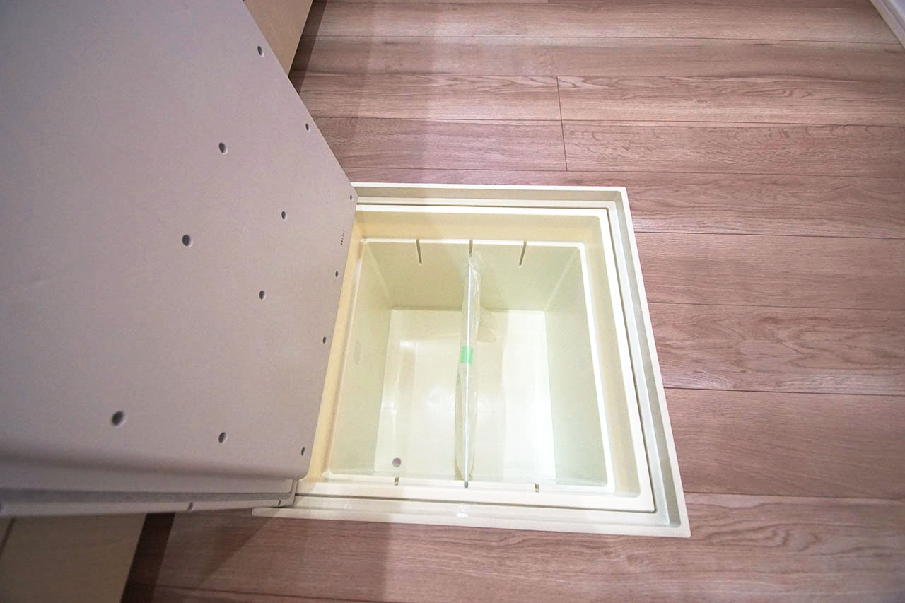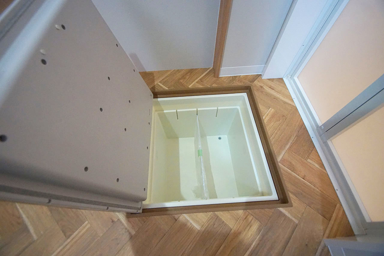 パウダールーム内の床下収納。シャンプーや洗剤などのストックに便利。