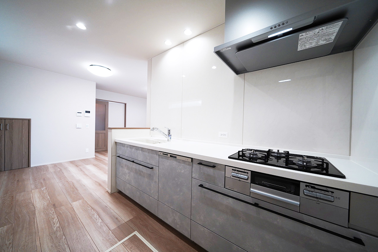 スタイリッシュなデザインと機能性を兼ね備えたキッチン。食洗機付きで後片付けもスムーズです。
