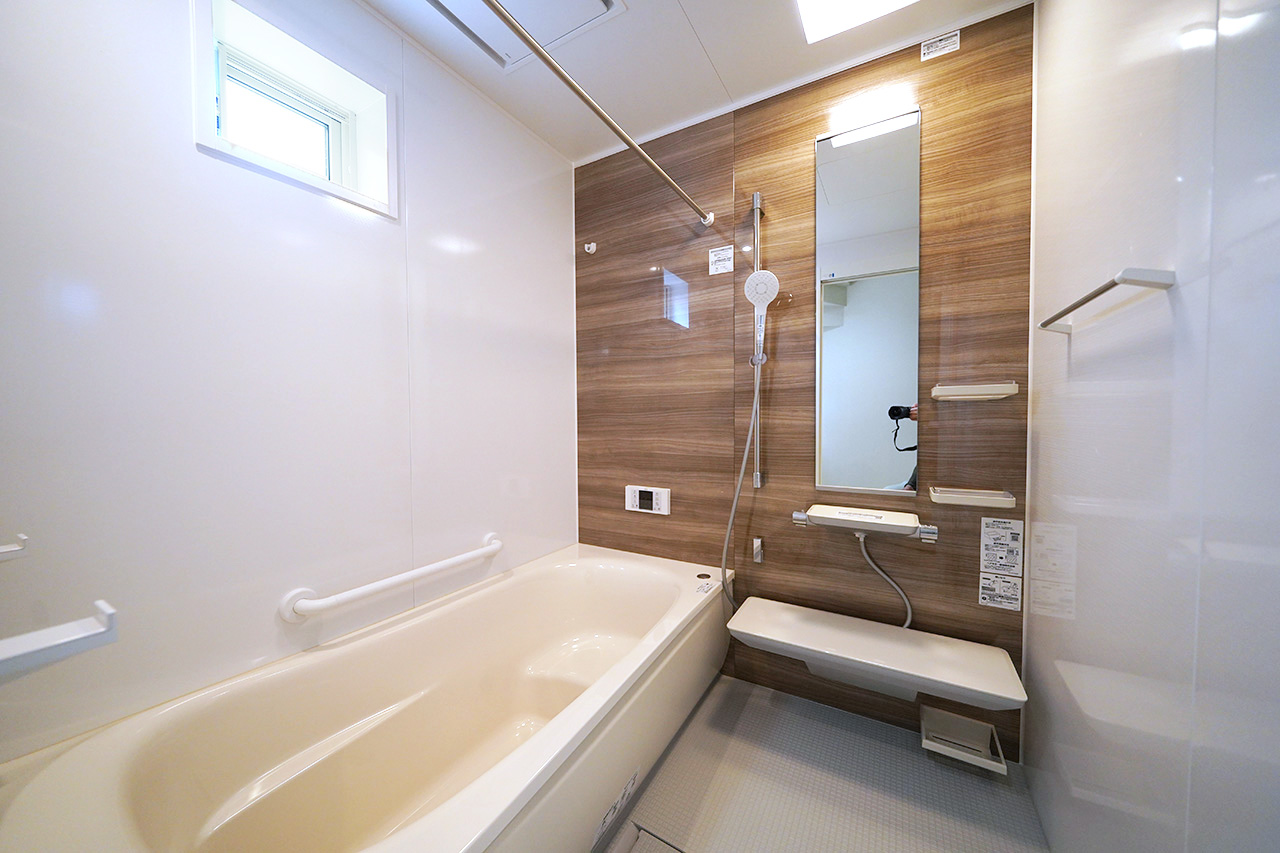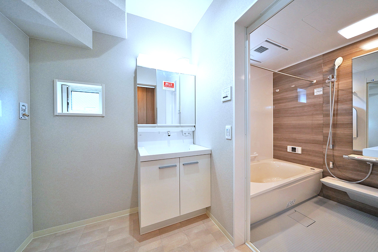 木目調パネルが落ち着きを演出するバスルーム。浴室乾燥機付きでいつでも快適なバスタイムをサポート。