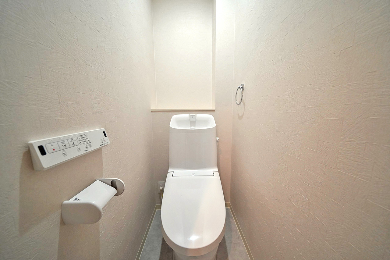 温水洗浄便座付きの清潔感あるトイレ。落ち着いた色合いでリラックスできる空間です。