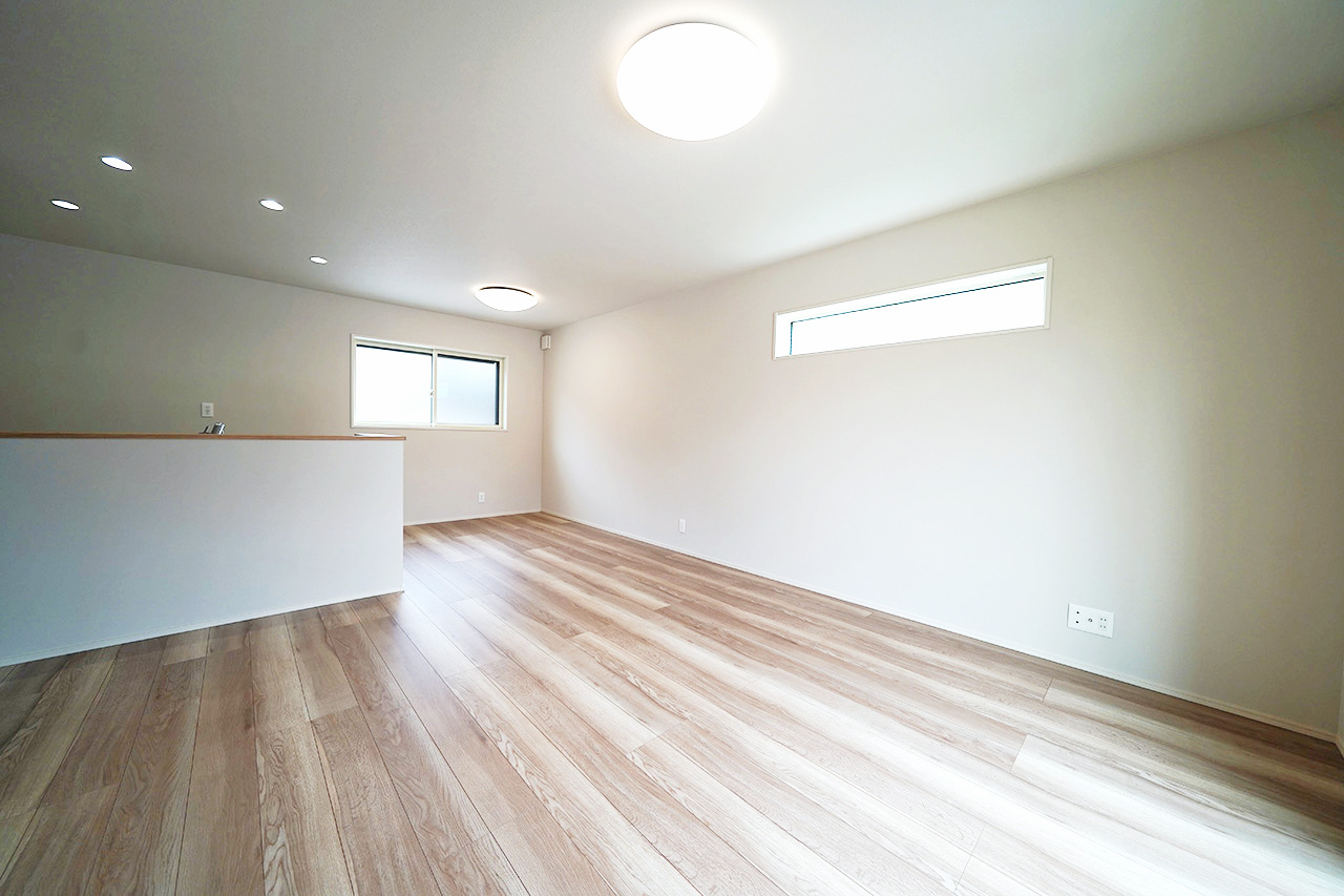 三面採光で明るく開放的なLDK。リビングにはプライバシーに配慮した高窓を使用しています。