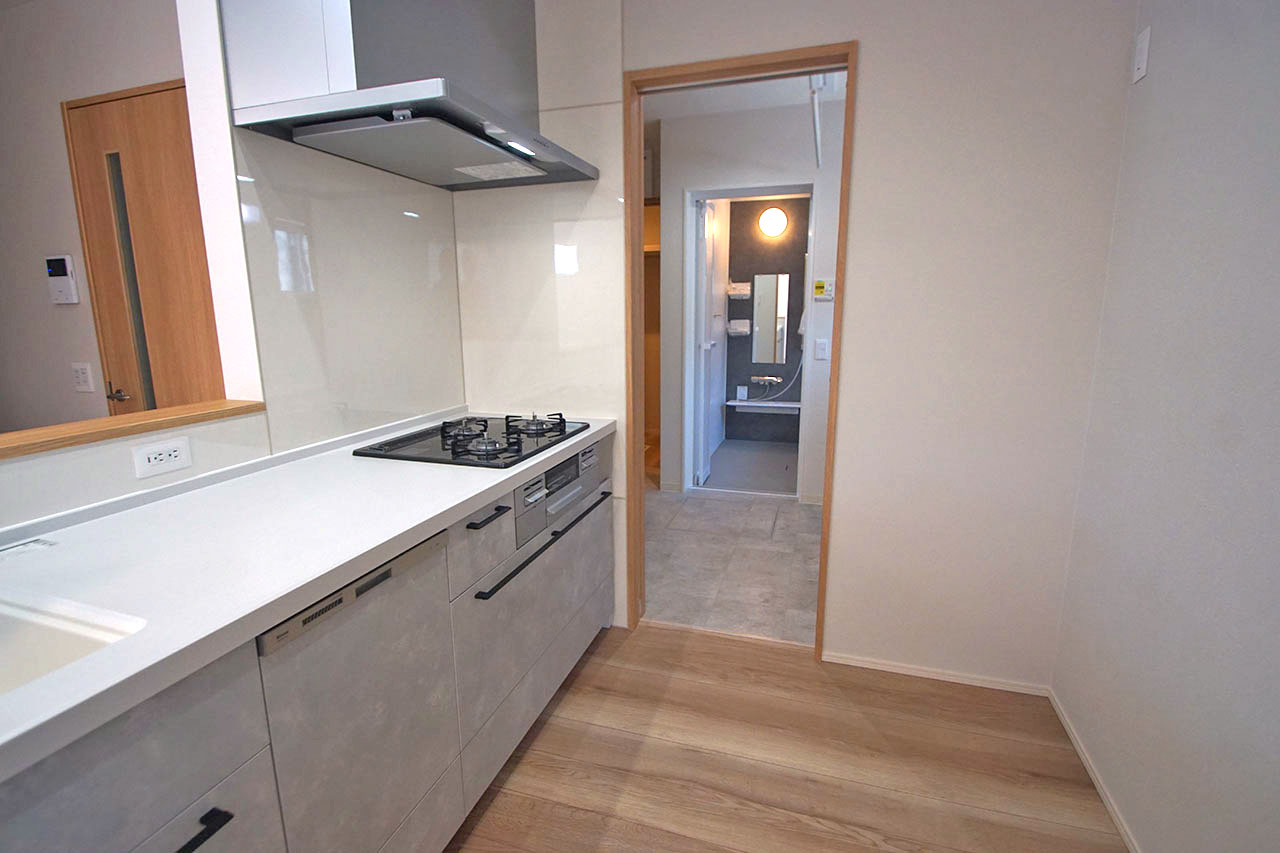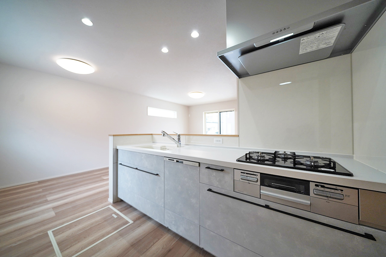 キッチンは、手洗いよりキレイに洗えて節水にもなる食洗機付き。また忙しい家事の時短にもなります。