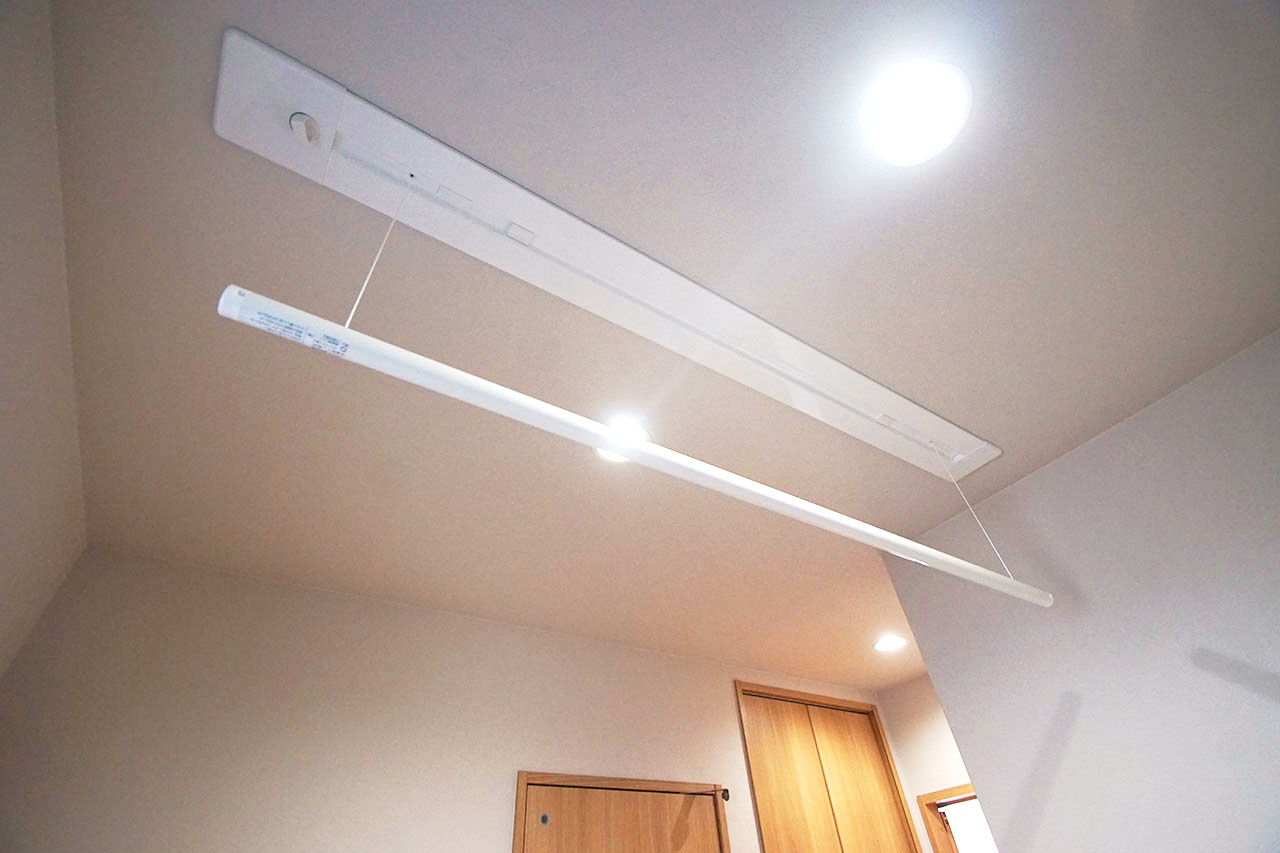 2階廊下にも室内物干を設置。お天気や時間帯に関係なくお洗濯物が干せます。