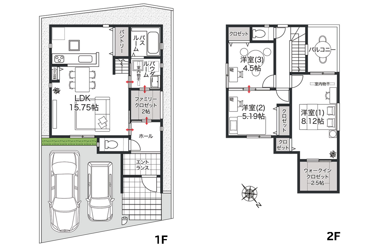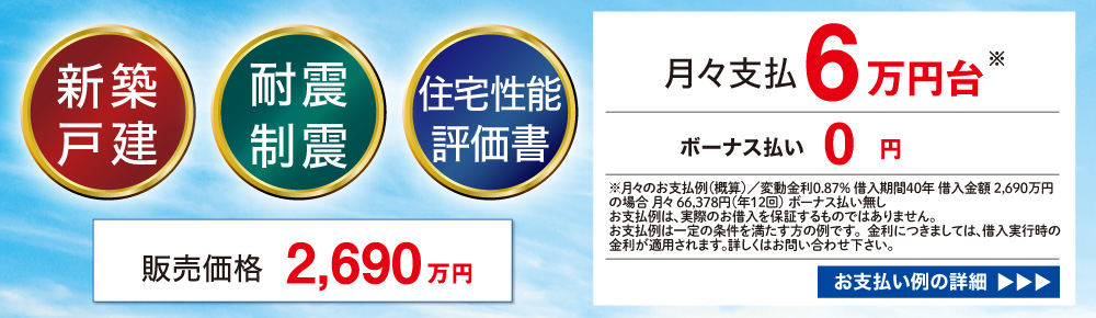 | 設備・特徴 | 電気 公営水道 都市ガス 公共下水 新築一戸建て アフターサービス保証付 耐震等級3 買物便利 公園近く 全居室洋室 収納多し 全居室収納あり ウォークインクロゼット ファミリークロゼット パントリー 複層ガラス 室内物干 トイレ2ヶ所 対面キッチン リビング階段 食洗機 浴室乾燥機 普通車1台軽1台OK | ||