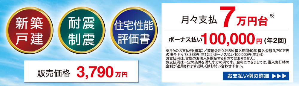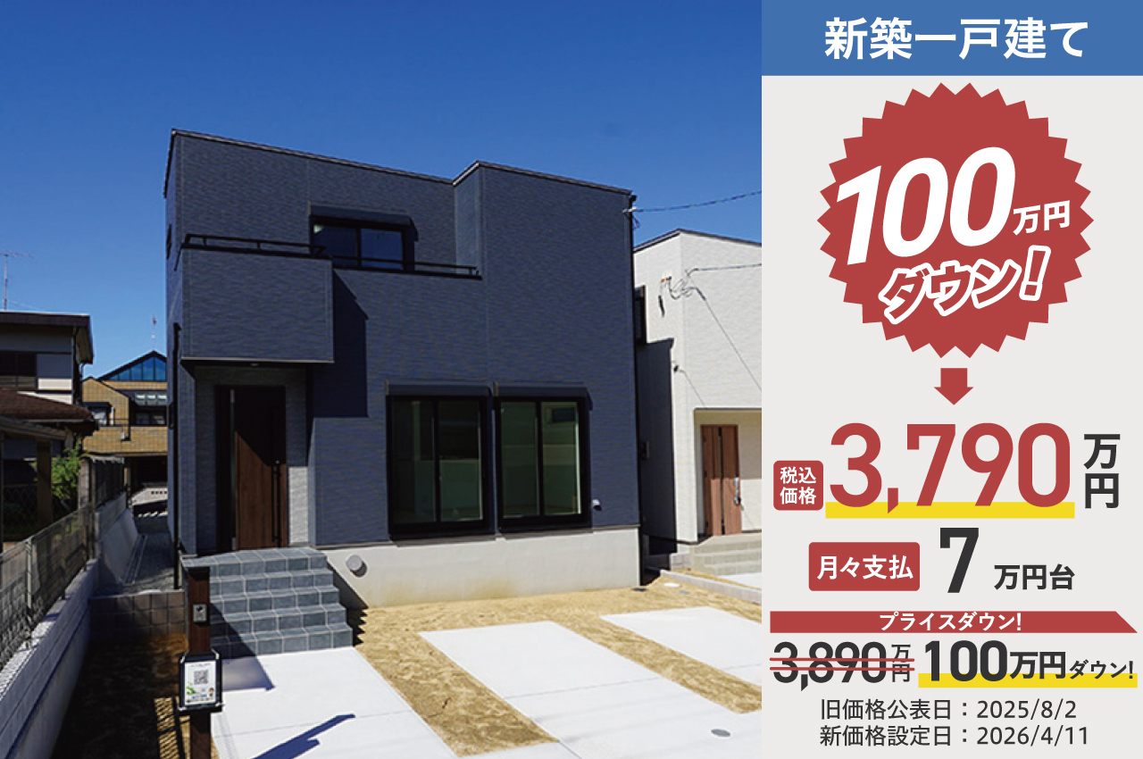 | 設備・特徴 | 電気 公営水道 都市ガス 公共下水 新築一戸建て アフターサービス保証付 炭の家 耐震等級3 買物便利 全居室洋室 収納多し 全居室収納あり ウォークインクロゼット シューズクローク ファミリークロゼット 複層ガラス 室内物干 トイレ2ヶ所 対面キッチン 勝手口あり 食洗機 浴室乾燥機 庭付き 駐車2台OK | ||