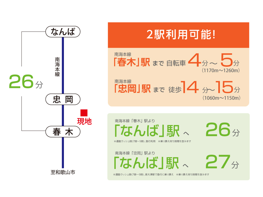 ・南海本線「忠岡」駅まで徒歩14分~15分、「春木」駅まで徒歩15分~16分