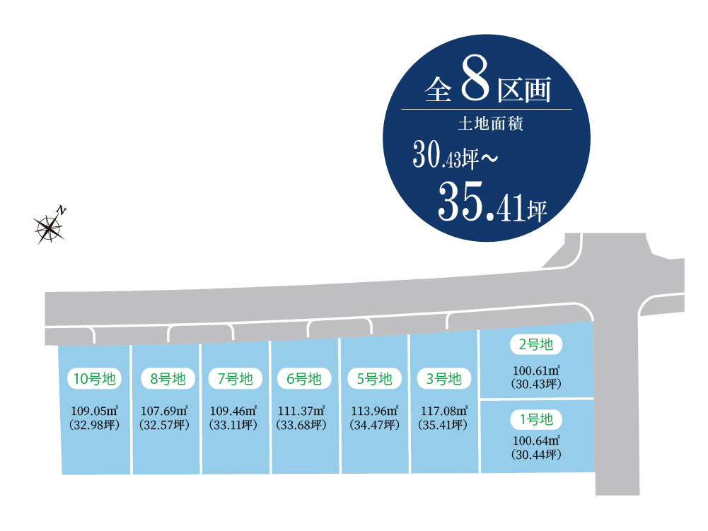・敷地面積30坪~35坪超の全8区画。角地あり◎