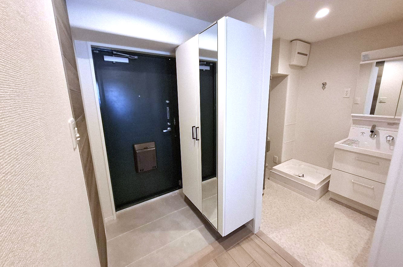 玄関周りもリフォームで一新。姿見付きの下駄箱も新調しました。