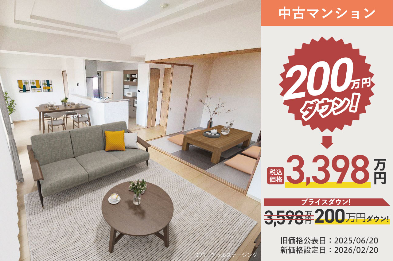 | 設備・特徴 | 一括受電でない 公営水道 都市ガス 公共下水 Reform CANVAS リフォーム完成 アフターサービス保証付 LDK16帖以上 角部屋 3面バルコニー 駐輪場 バイク置場 浴室窓 玄関ポーチ付き 駅近 学校近し 買物便利 照明器具 食洗機 浴室乾燥機 カウンターキッチン 浄水器 勝手口あり 宅配BOX オートロック | ||