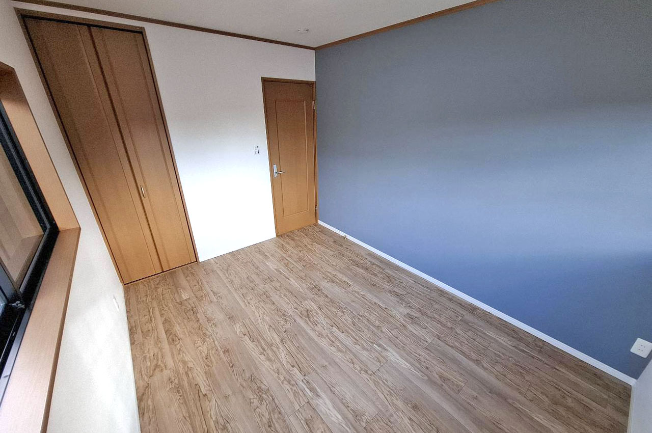 洋室②の壁一部には、ネイビーのアクセントクロスを施しました。