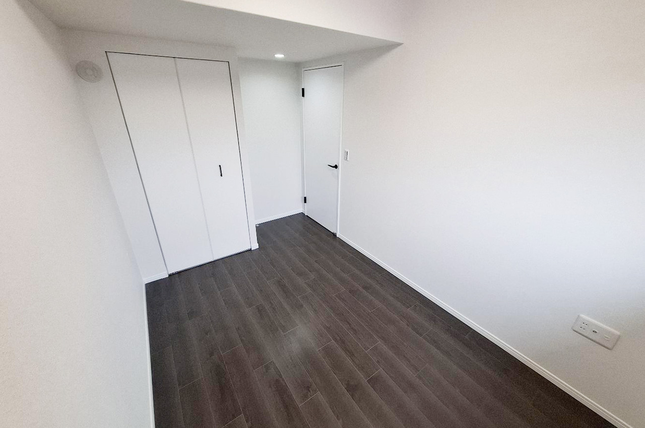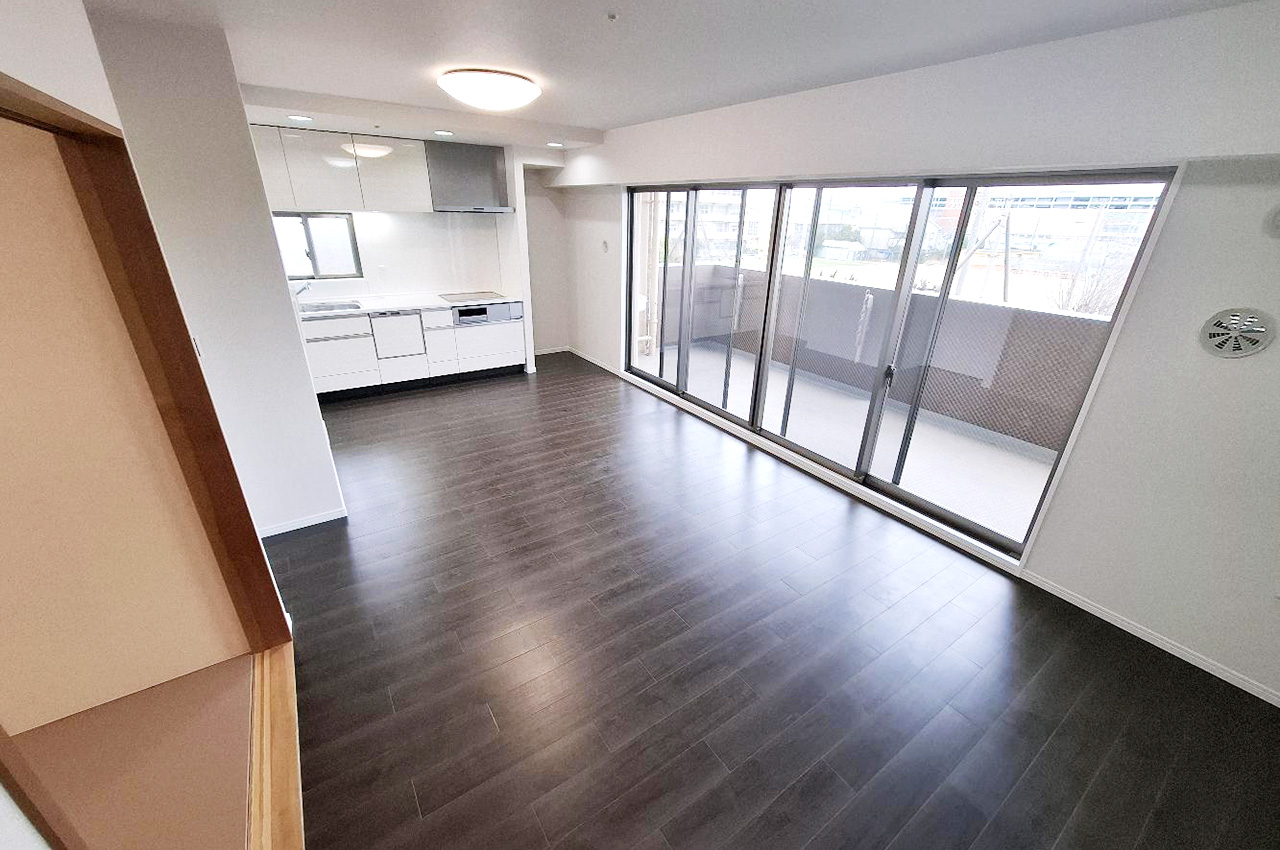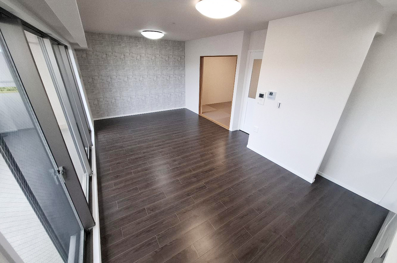 内装や水廻り設備を新調しました。白い壁とダークなフローリングのコントラストが際だつ室内です。