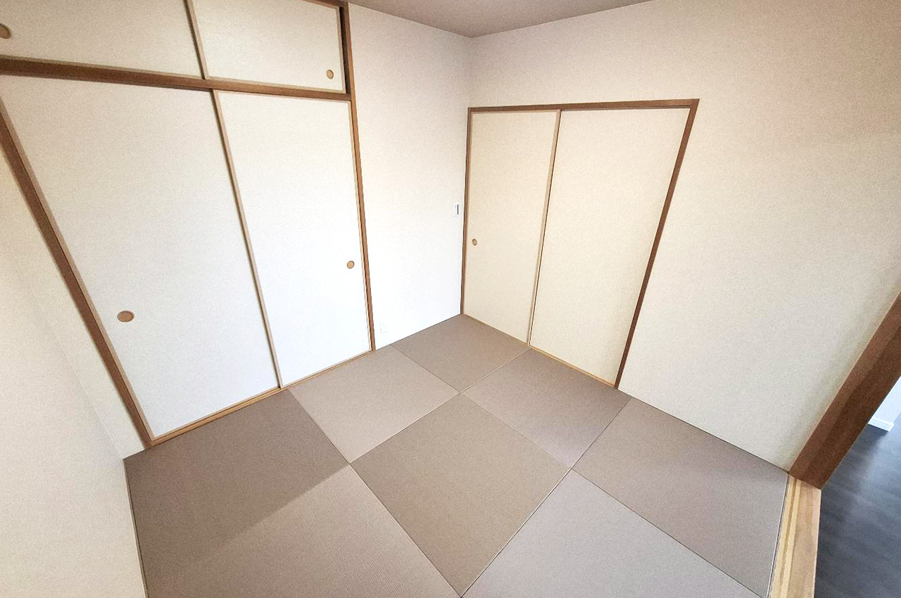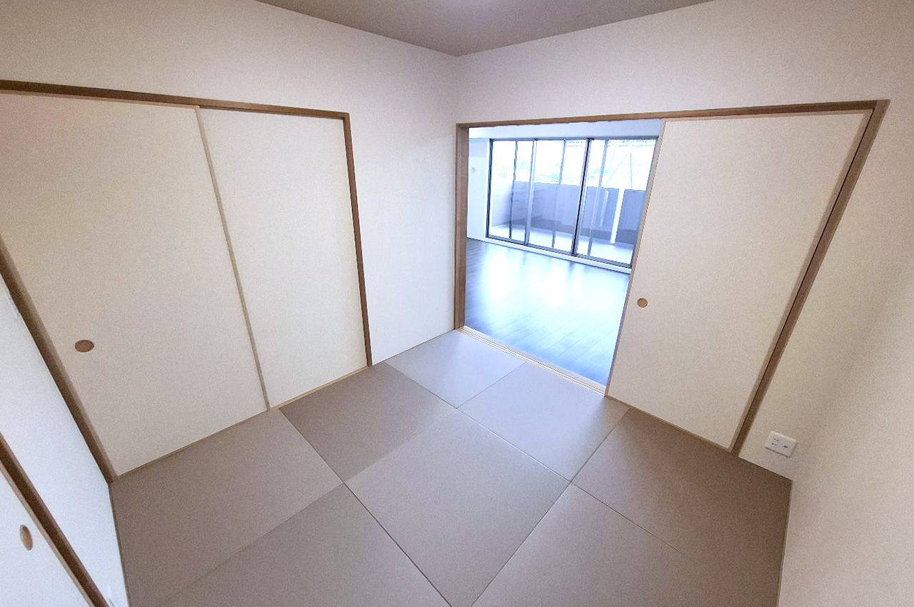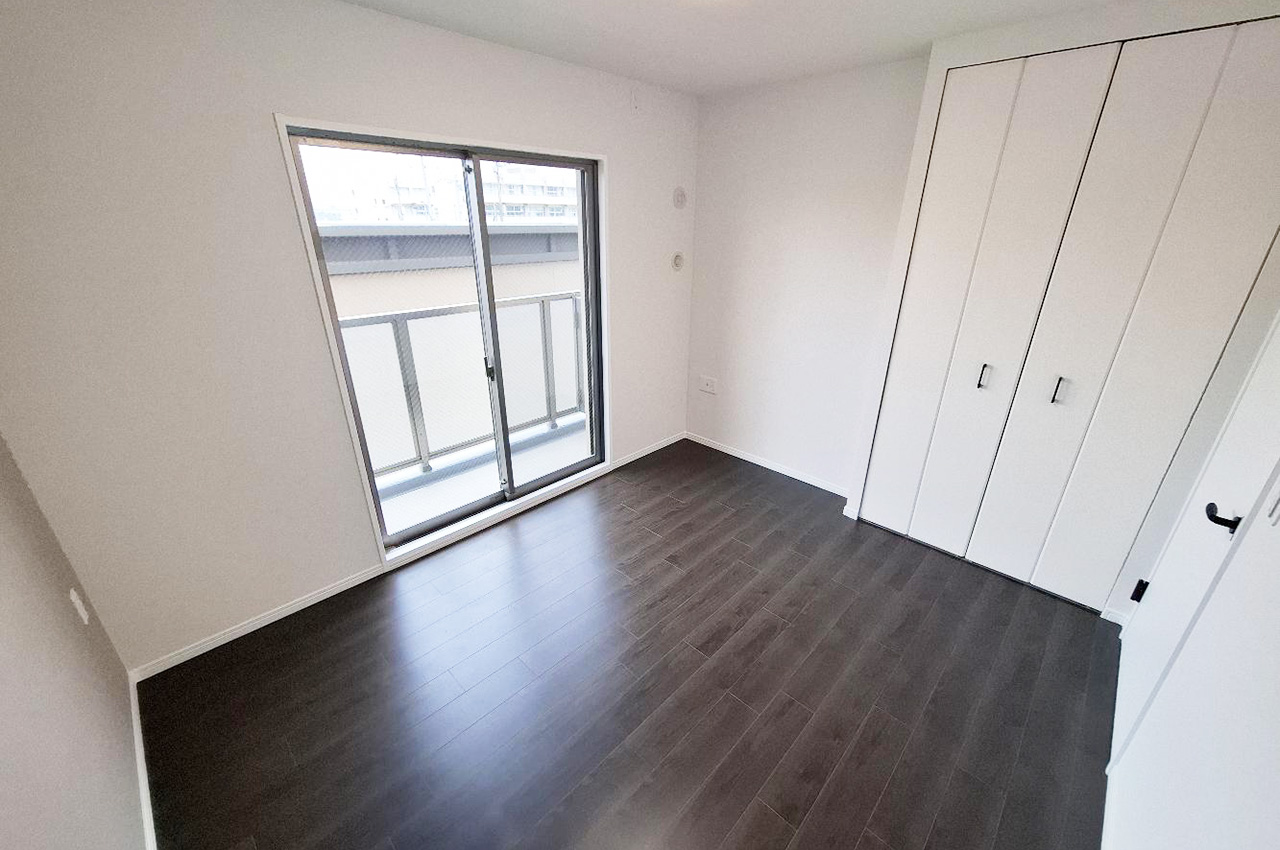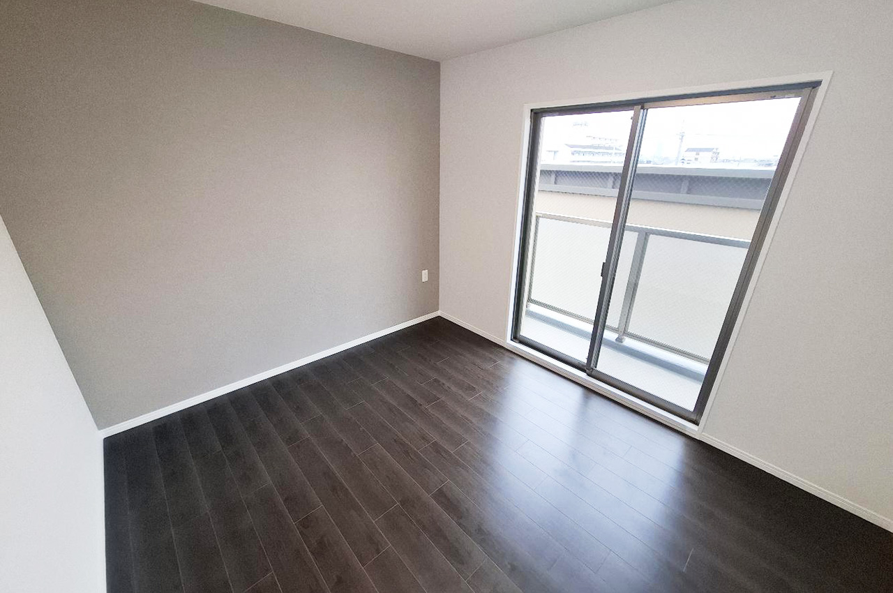 内装や水廻り設備を新調しました。白い壁とダークなフローリングのコントラストが際だつ室内です。