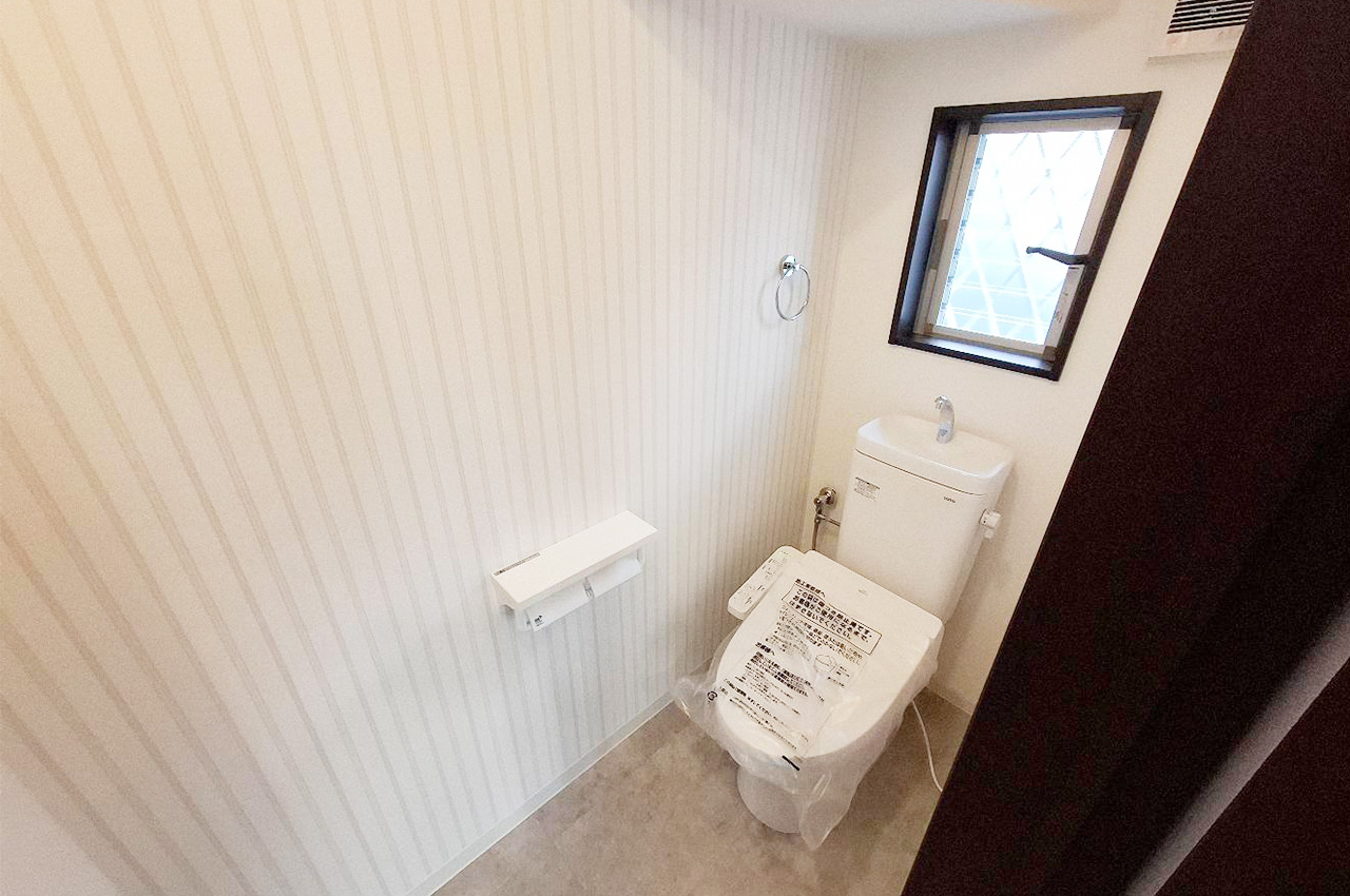 トイレ:フルリフォームしました。ストライプ柄のアクセントクロスで広さを演出